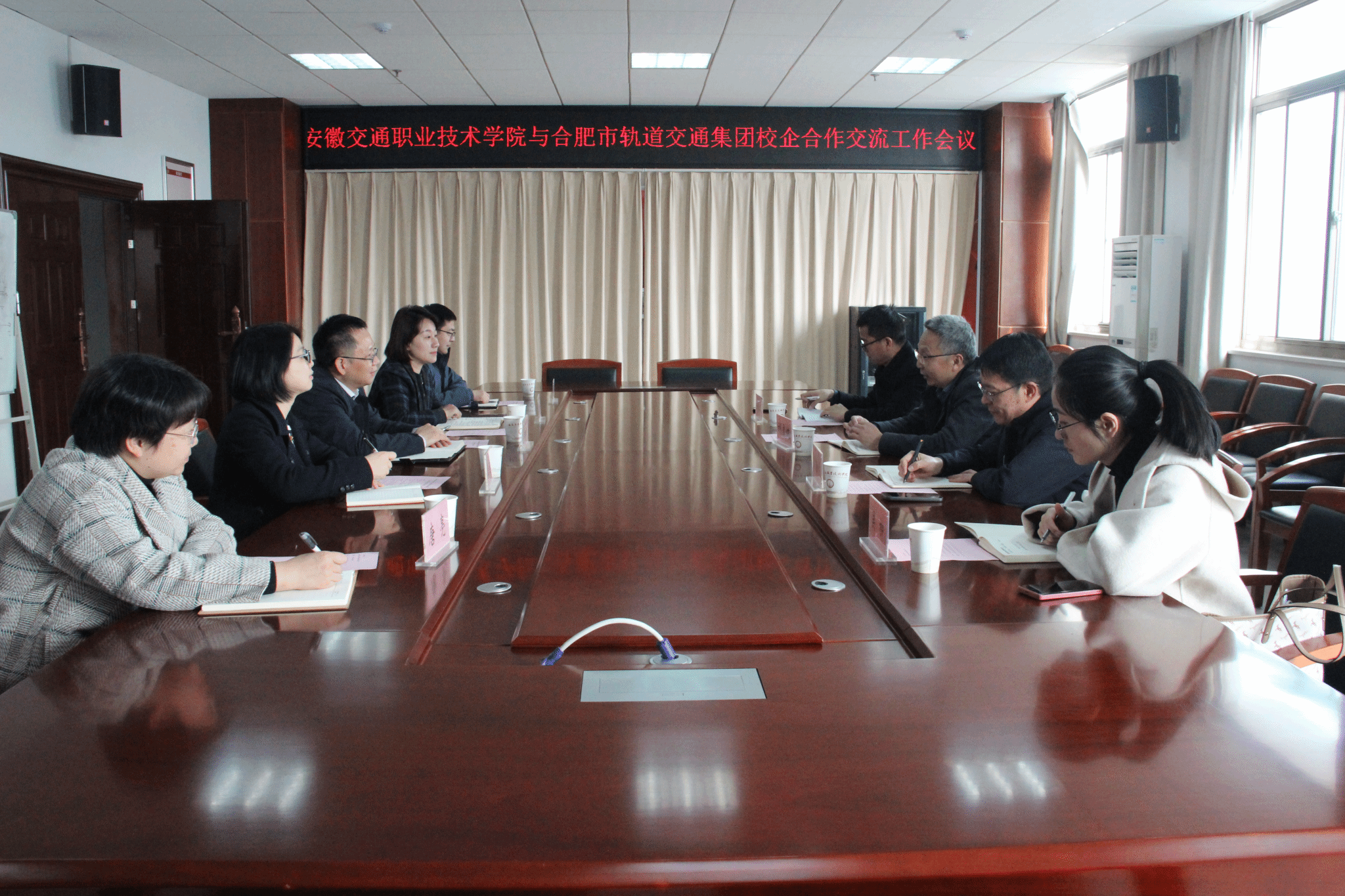 3月26日下午,合肥市轨道交通集团有限公司集团副总经理胡勇健,科技创新与教育发展中心主任陶治来、副主任孙永路、高级主管吴柳一行四人来校洽谈校企合作事宜。院党委副书记杨菲铃、城信系党总支书记汪倩、副主任(主持工作)兰清群、副主任李志成等参会。