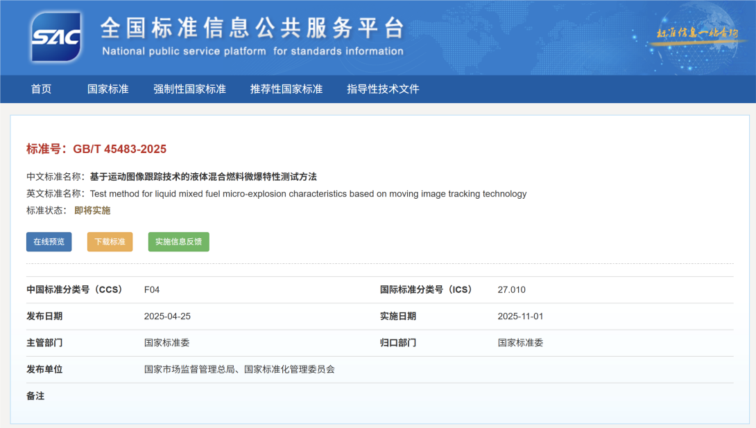 基于运动图像跟踪技术的液体混合燃料微爆特性测试方法国家标准于2023年12月29日经国家标准化管理委员会国家标准委发文批准,全国燃烧节能净化标准化技术委员会(TC441)承担《基于运动图像跟踪技术的液体混合燃料微爆特性测试方法》(中文计划号:20232508-T-469)标准的归口管理和制修订工作。在经历了5次制修订后,该标准于2025年4月25日在全国标准信息公共服务平台发布公告。