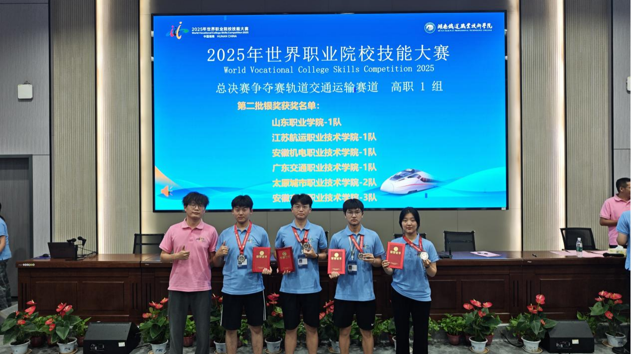 8月31日,2025年世界职业院校技能大赛总决赛争夺赛轨道交通运输赛道(高职1组)在湖南铁道职业技术学院圆满落幕。经过激烈角逐,米兰轨道交通学院教师许兴阳、苗伟指导的王方熙、付梦君、郑浩、刘茂强团队和教师程斌、颜争指导的汪轻扬、姜文博、蒋浩扬、王子同团队分别获得银奖(二等奖)、铜奖(三等奖)。