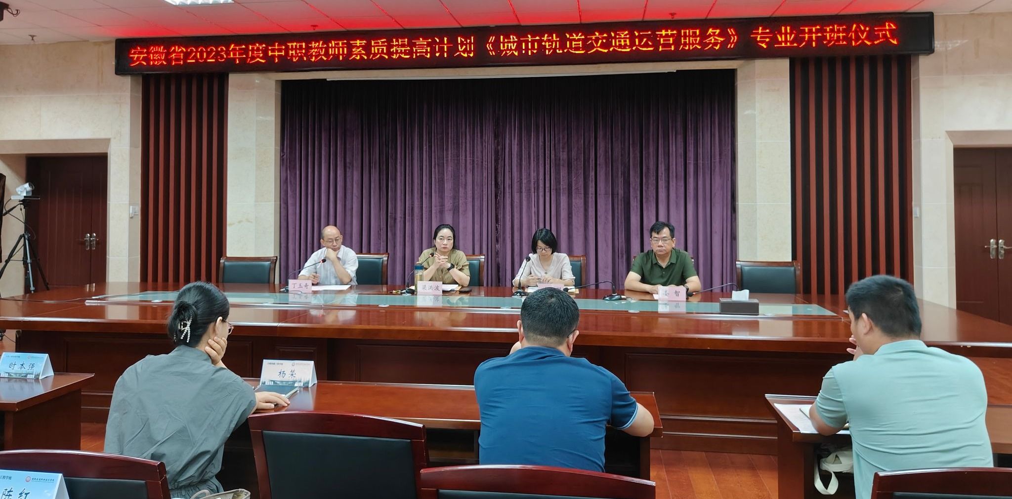 7月17日上午,2023年度中职教师《城市轨道交通运营服务》专业素质提高计划省级培训班,在学院信息楼九楼会议室举行开班仪式。院党委委员、汽车与机械工程系主任梁洪波,城信系副主任(主持工作)兰清群、副主任娄智,教务处(成人教育部)副主任丁玉奇、轨道运营教研室主任李志成及培训教师代表出席开班仪式,仪式由丁玉奇主持。