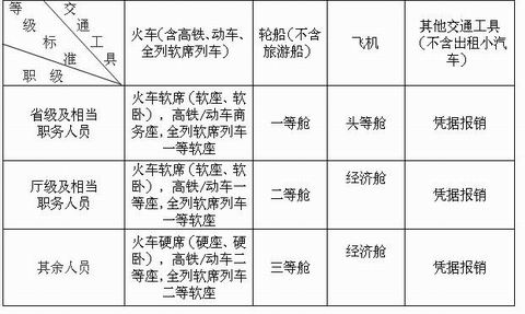 第六条 出差人员应当按规定等级乘坐交通工具。出差人员乘坐交通工具等级见下表: