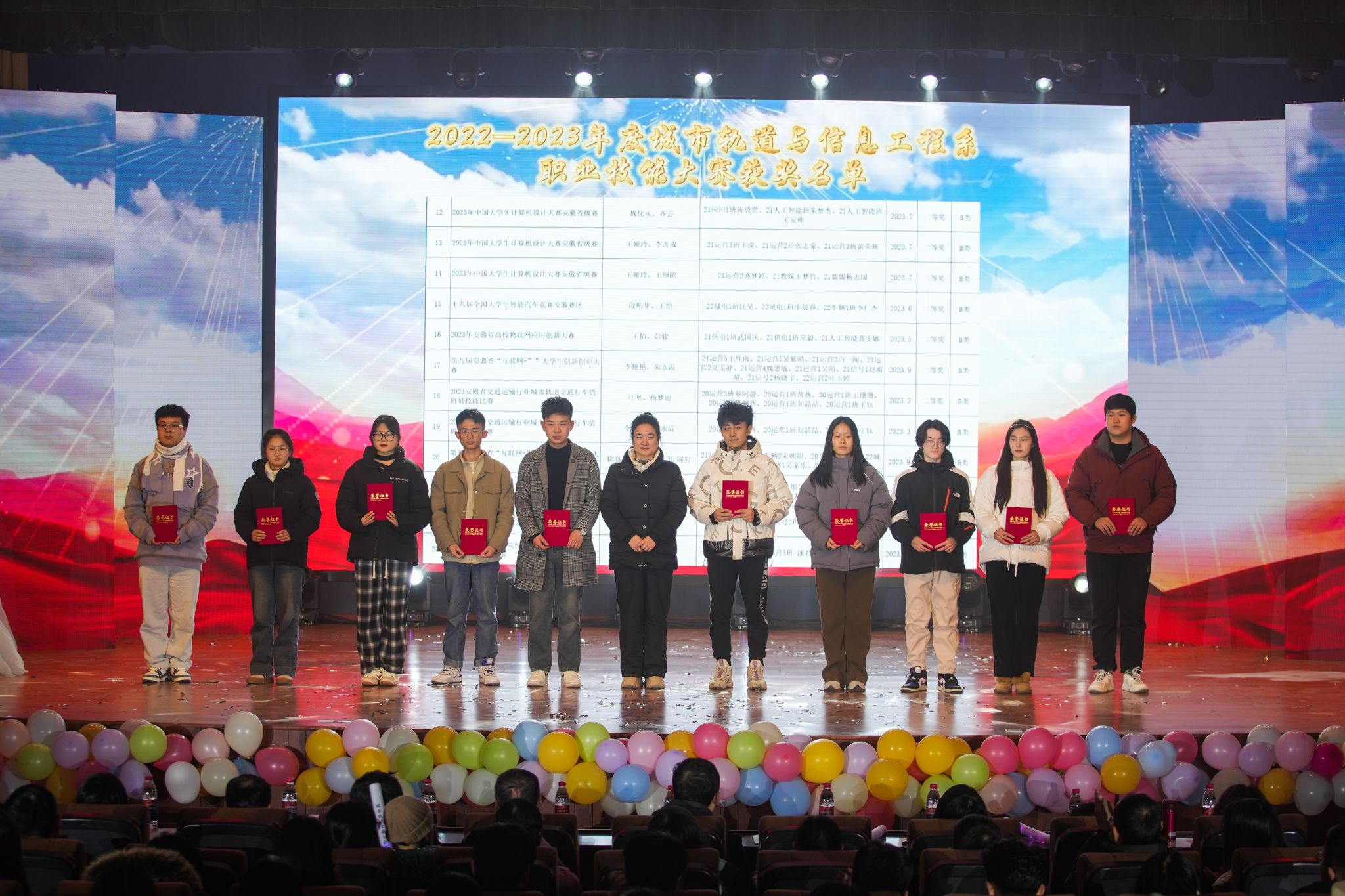 第二篇章“青春有志”通过一系列富有城信特色的节目展现校园生活,表达对新生们的美好期待。合唱歌曲《青春不停息》带同学们畅想校园生活的无限可能,小品《王诈遇王诈》通过幽默诙谐的方式向同学们展示了诈骗的危害性,说唱歌曲《红色》活力四射,引动全场。接着院、系领导相继给优秀教师、先进班级和文体大赛获奖者进行了颁奖。
