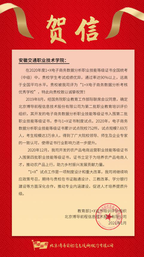 近日,米兰被教育部1+X证书培训组织单位——北京博导前程信息技术股份有限公司评为“1+X电子商务数据分析考核优秀学校”。