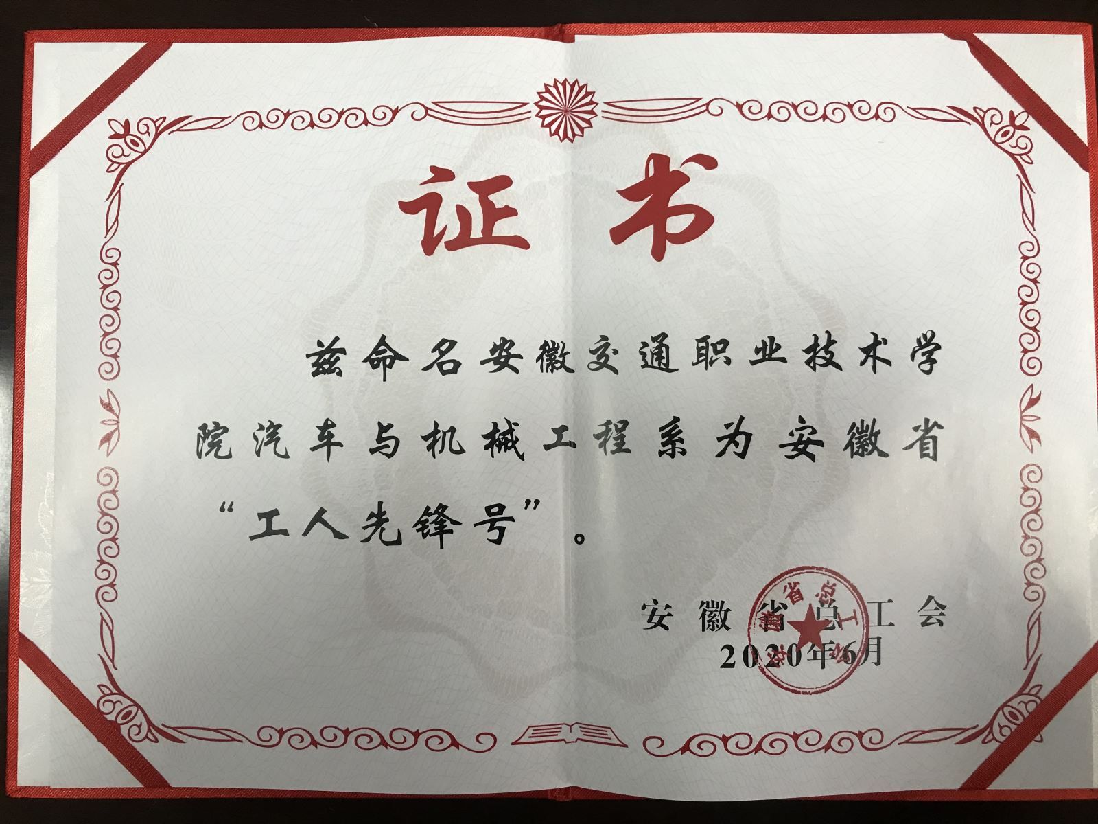 安徽省“工人先锋号”是为了表彰全省各类企事业单位中具有时代性、先进性和示范性的部门和组织。近年来,汽车与机械工程系在院党委的坚强领导下,坚持习近平新时代中国特色社会主义思想为指导,认真贯彻落实党的教育方针政策,巩固马克思主义在意识形态工作的指导地位,坚持党对教育教学的全面领导,以教师队伍建设为基础,以立德树人为根本,加强思想政治引领,筑牢学生理想信念,以教育教学质量提高为中心、以校企深度合作为载体、以新专业发展为抓手、以教科研为动力,激发师生员工干事创业的内生动力,不断深化教育教学改革,将课堂、课程、教师、学生四个要素有机融合和统一,求真务实,积极探索和研究职业教育规律,抓住汽车与机械工程系新专业发展转型的关键期,系党政领导班子带领全系师生员工团结奋进,心往一处想、劲往一处使,凝心聚力,开拓创新,形成了“奋发向上有活力,团结和谐有凝力,敢创敢干有战斗力”的良好系风,造就了一支敬业爱生、进取奉献、本领过硬、勇于创新的师资队伍。在全系师生员工的共同努力下,汽机系党的建设坚强有力,教风学风严谨规范,校企合作逐步拓展,士官生培养迈上台阶,技能大赛成效显著。