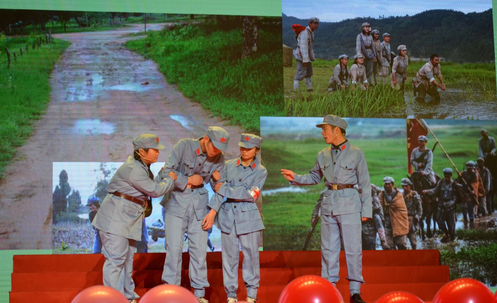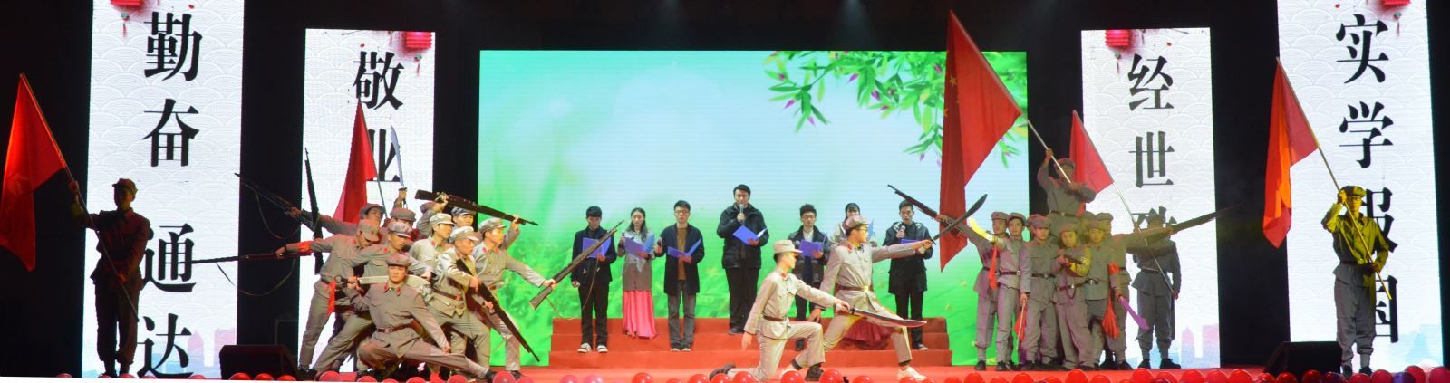 舞蹈《舞动中国》拉开晚会的序幕,晚会以纪念中国工农红军长征胜利80周年为主题分为三个篇章。第一篇章:雄关漫道真如铁。情景朗诵《长征是首歌》将观众带入到那个艰难困苦的岁月,一起体会革命前辈为了新中国的成立不畏牺牲和险阻的精神。小品《重走长征路》生动的展现出了革命前辈们团结一心永不放弃革命理想的可贵精神。教职工表演的舞蹈《春之韵律》,表达了人们对和平生活的美好向往。校友程祺演唱的歌曲《中国人》更是激起了在场每一位观众浓浓的民族自豪感。