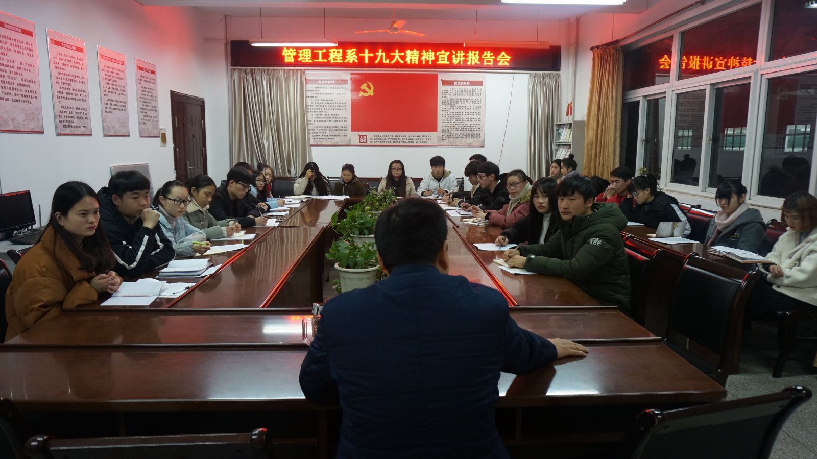 12月21日晚7时,我系党的十九大精神学习小组成员在系会议室进行第四次集中学习。管理系副主任岳朝晖担任主讲。