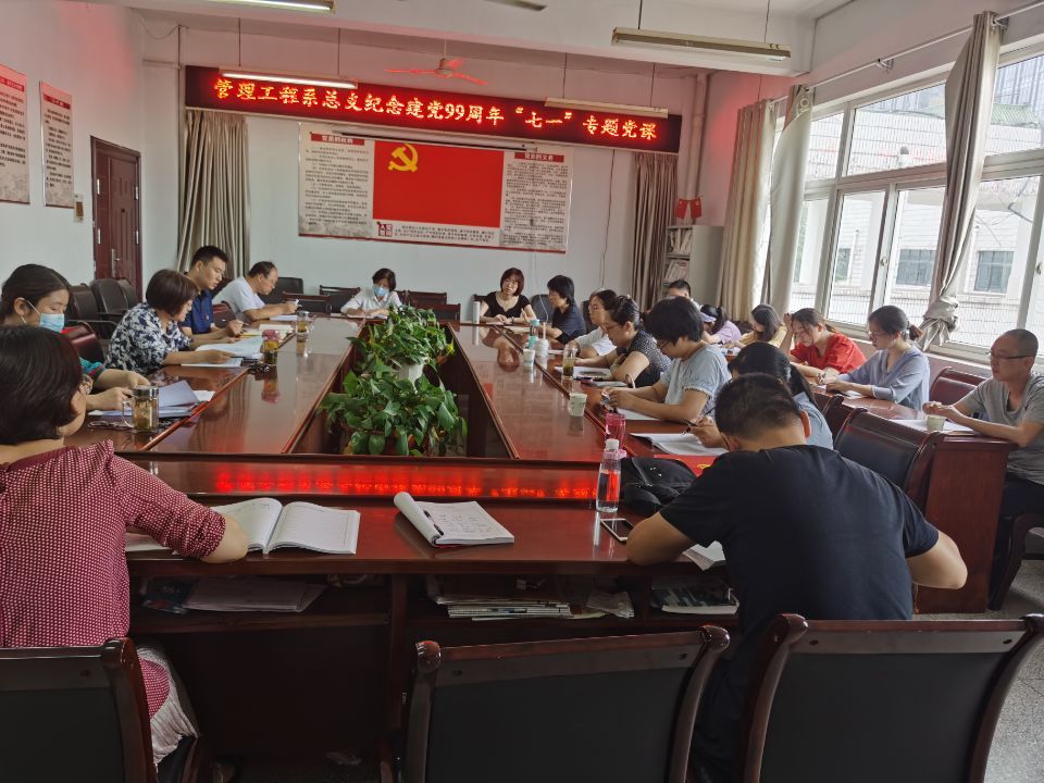 7月9日上午,管理工程系开展“七一”党课活动,领导班子成员系总支书记汪思曼、系主任刘安婕、副主任岳朝晖分别给全体党员上党课,庆祝共产党成立九十九周年。