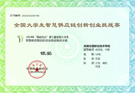 2024年6月2日-3日,2024年“链战风云”第七届全国大学生智慧供应链创新创业挑战赛总决赛于线上举行,由我系郭洁筠、李慧两位老师指导何慧、郑浩、周锐、汪悦四名同学组成的UP队,一路过关斩将,最终取得全国高职组银奖的好成绩。