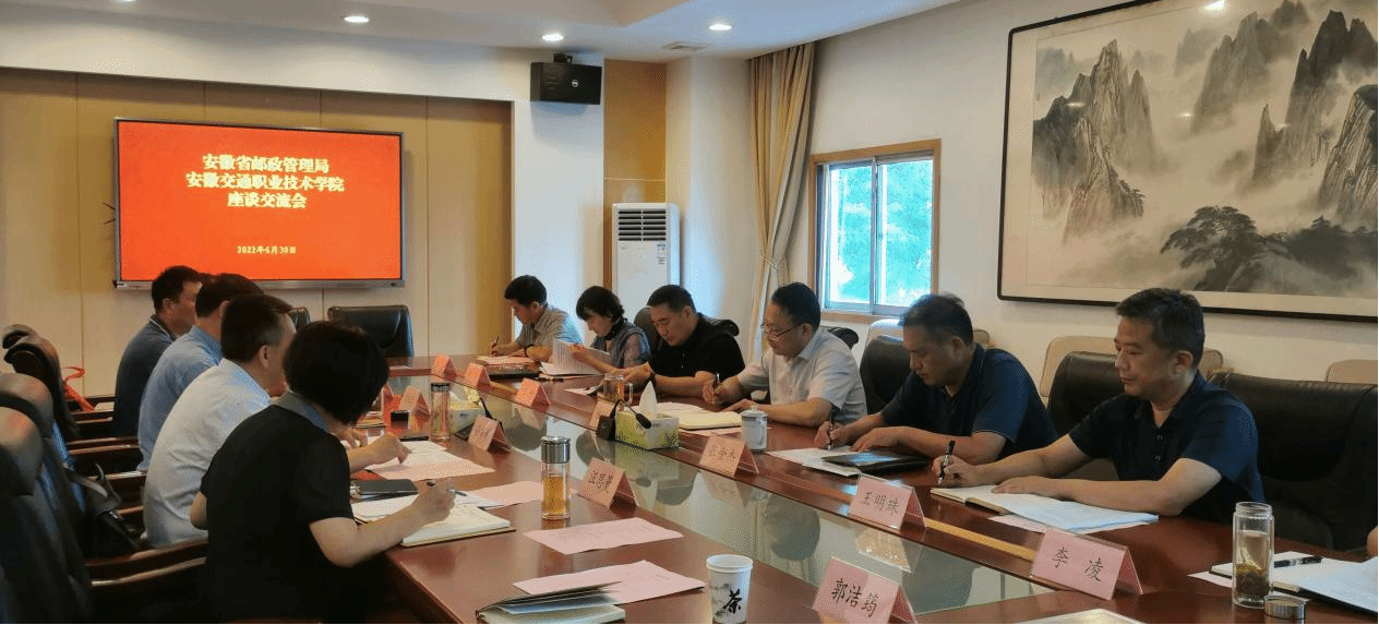 2022年6月30日下午,学院走访安徽省邮政管理局,与行业主管单位就邮政快递运营管理人才培养座谈交流,共商专业建设大计。安徽省邮政管理局局长伍洲文接待学院党委书记孙顺利、院长张国栋一行。省邮政管理局政策法规处处长张金杰、普遍服务处处长王清、市场监管处处长王明珠、人事处处长罗文、市场监管处二级调研员李凌、办公室副主任郭正、学院管理系总支书记汪思曼、管理系主任岳朝晖、物流教研室主任胡勇、物流专业骨干教师郭洁筠参加座谈会。