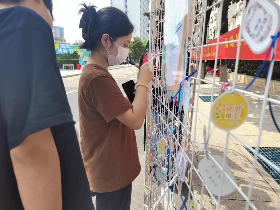 管理系在教学楼下设立“桃李芬芳,感念师恩”青年学生庆祝教师节的寄语展板吸引了同学们的纷纷驻足,一张张随风飘动的卡片,卡片里一句句真挚的寄语,是同学们用真心的文字、赤诚的言语感谢老师们的悉心指导与不倦教诲。