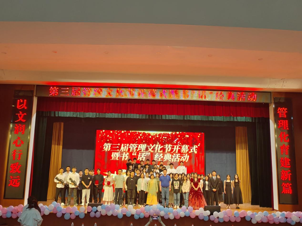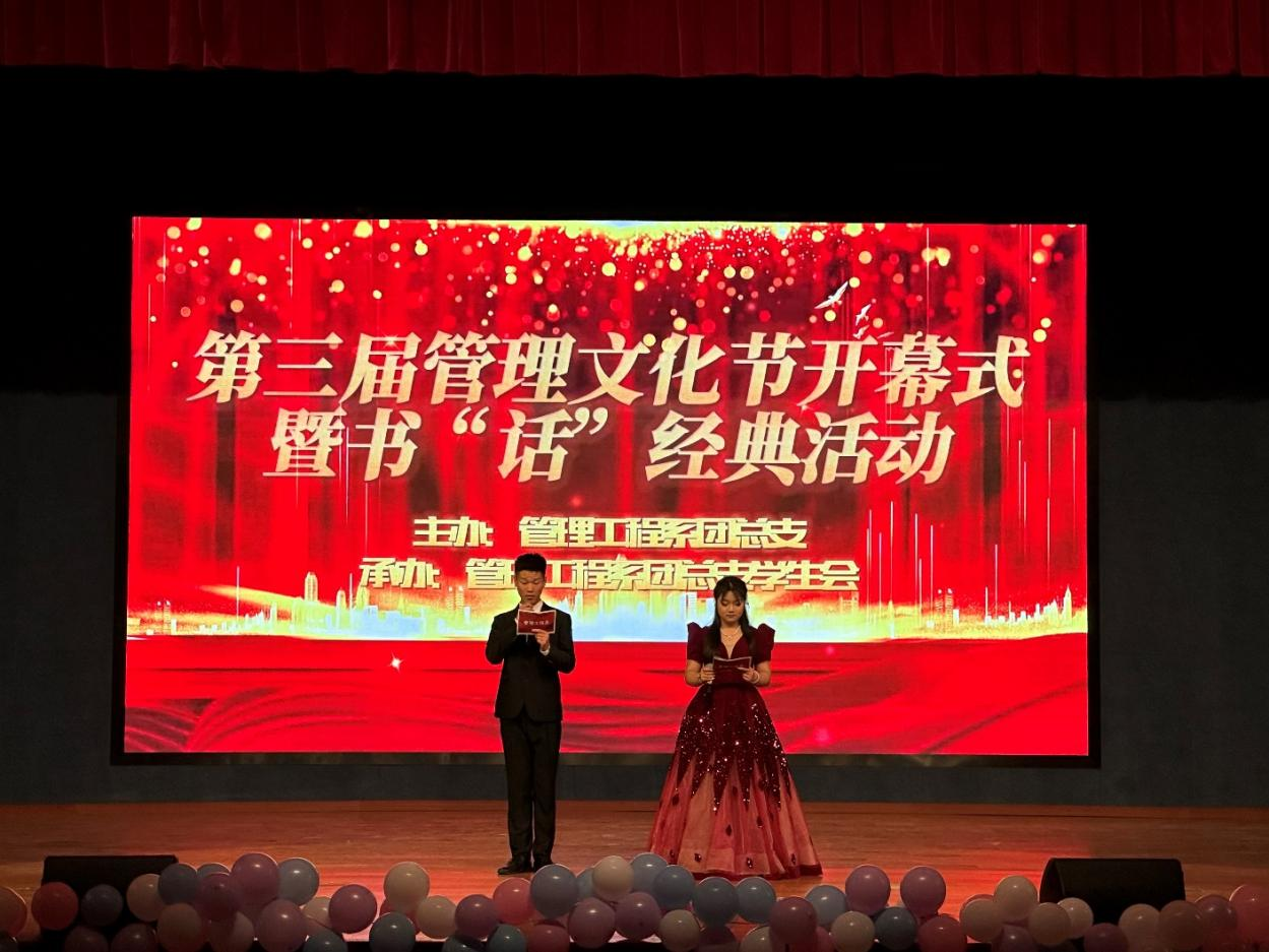 为深入学习贯彻习近平新时代中国特色社会主义思想,推进校园文化建设,丰富大学生校园文化生活,5月11日下午,管理系团总支在南区大礼堂举办第三届管理文化节开幕式暨阅读沙龙活动。管理系党总支书记汪思曼副书记陶琪,学生处副处长、院团委书记刘元元,院团委委员、大学生艺术团指导老师王萌钰以及管理系学管教师出席本次开幕式,并担任“话”经典活动评委。