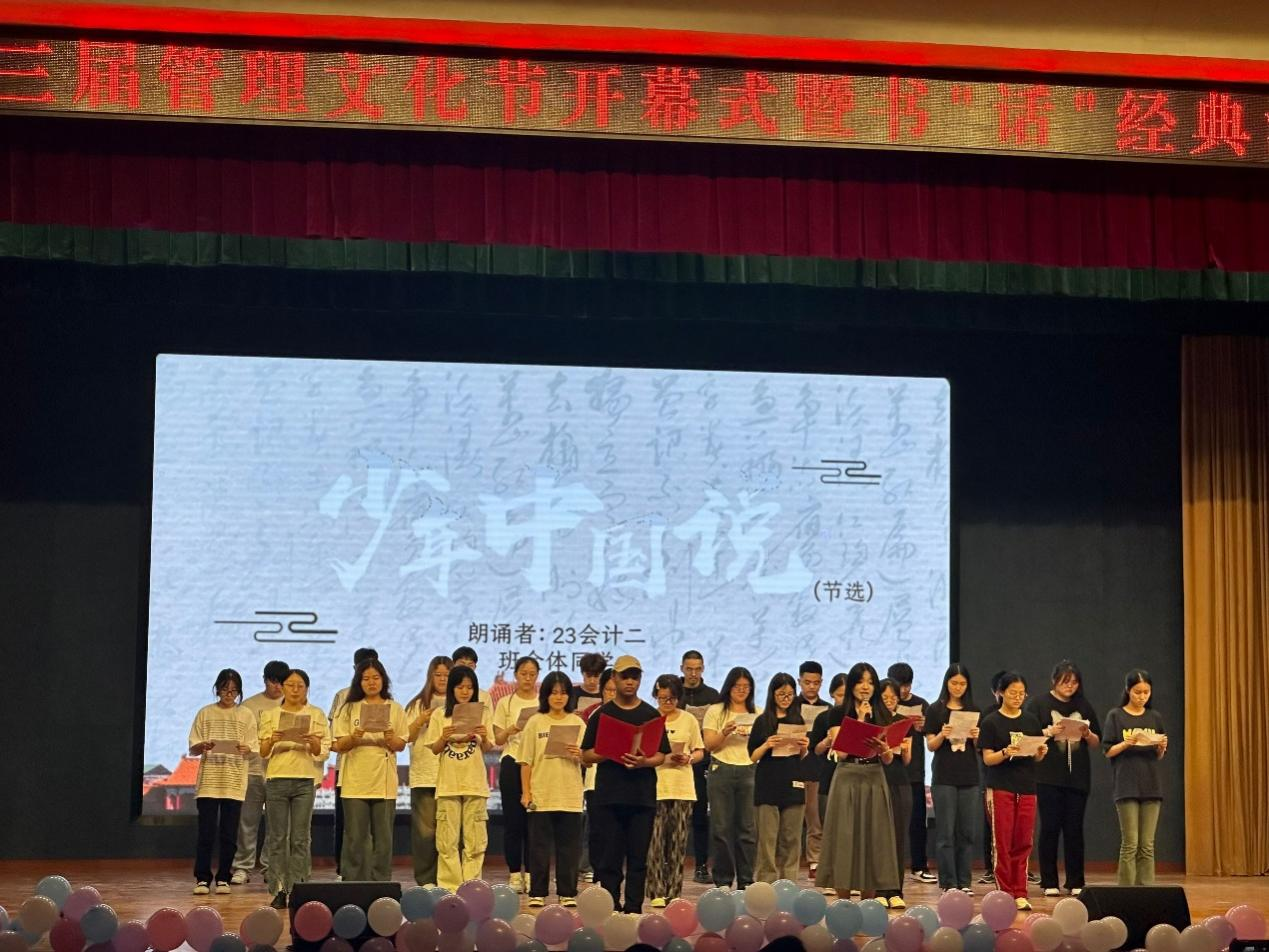 一曲开场舞后,汪思曼为本次文化节致开幕词。她指出,一年一度的管理文化节既是加强校园文化建设、展示校园文化艺术的最佳载体,也是学校实施素质教育的重要阵地。她鼓励同学们在积极参与文化节活动的过程中,享受快乐、锻炼身体,体验奋斗拼搏和团结协作精神带来的恒久感动,体会阅读对精神世界的丰富,欣赏音乐的韵律和唯美,感悟书法的魅力和优秀传统文化的博大精深。她强调,广大青年要锤炼品德、完善人格、塑造心灵、提升审美,不断增强做中国人的志气、骨气、底气,做志存高远、德才并重、情理兼修、勇于开拓、堪当民族复兴重任的时代新人,在推进强国建设、民族复兴伟业中展现青春作为、彰显青春风采、贡献青春力量,奋力书写为中国式现代化挺膺担当的青春篇章!