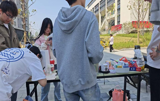 活动现场设立了两个摊位,宛如热闹的集市。摊位上的物品琳琅满目,从闲置的书籍、玩具,到独具匠心的手工艺品,每一件物品都承载着同学们满满的爱心。