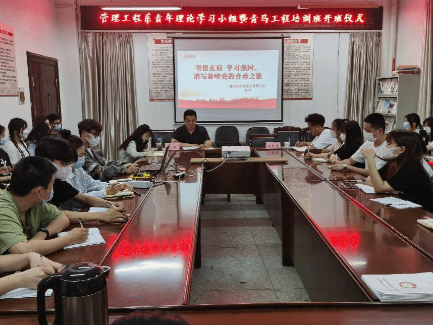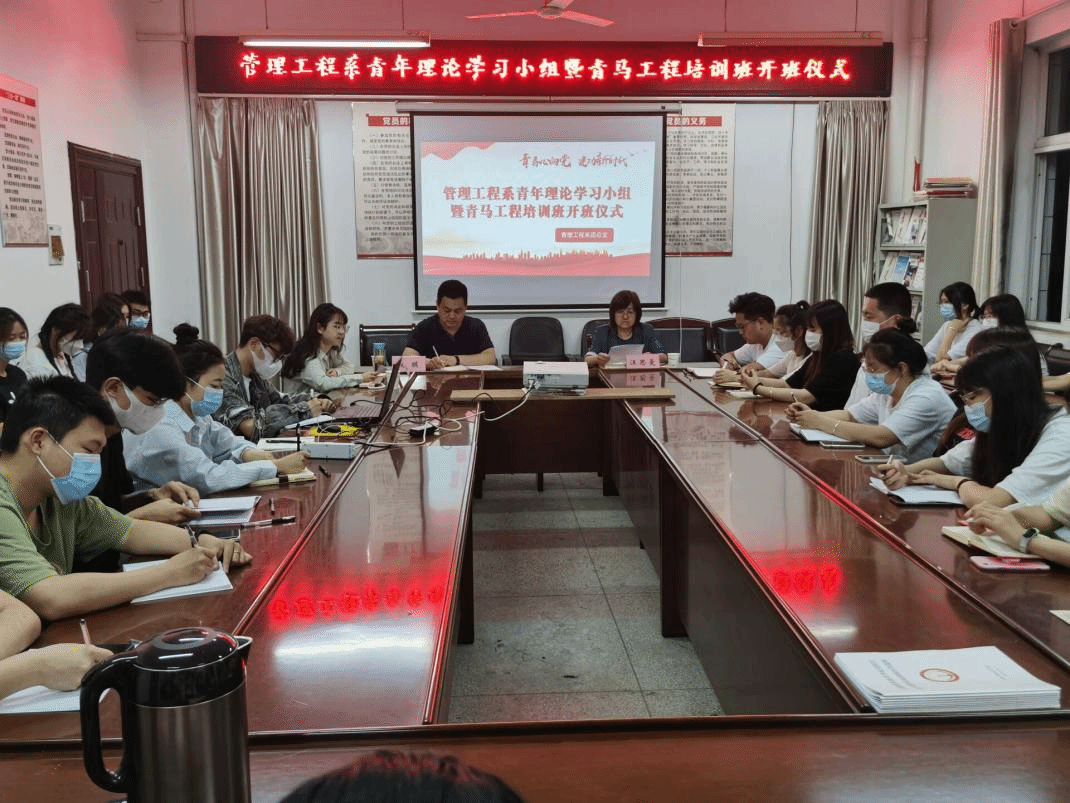 为进一步推动马克思主义理论在青年中广泛传播,加强思想教育引领,努力培养一批信仰坚定、能力突出、作风过硬的青年学生骨干,根据院团委关于成立马克思主义青年理论学习小组建议,5月6日,管理工程系在系会议室举行青年理论学习小组、“青年马克思主义者培养工程”培训班开班仪式。系党总支书记汪思曼、副书记陶琪、青年理论学习小组及青马工程所有学员参会,开班仪式由系团总支书记王思敏主持。