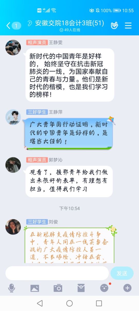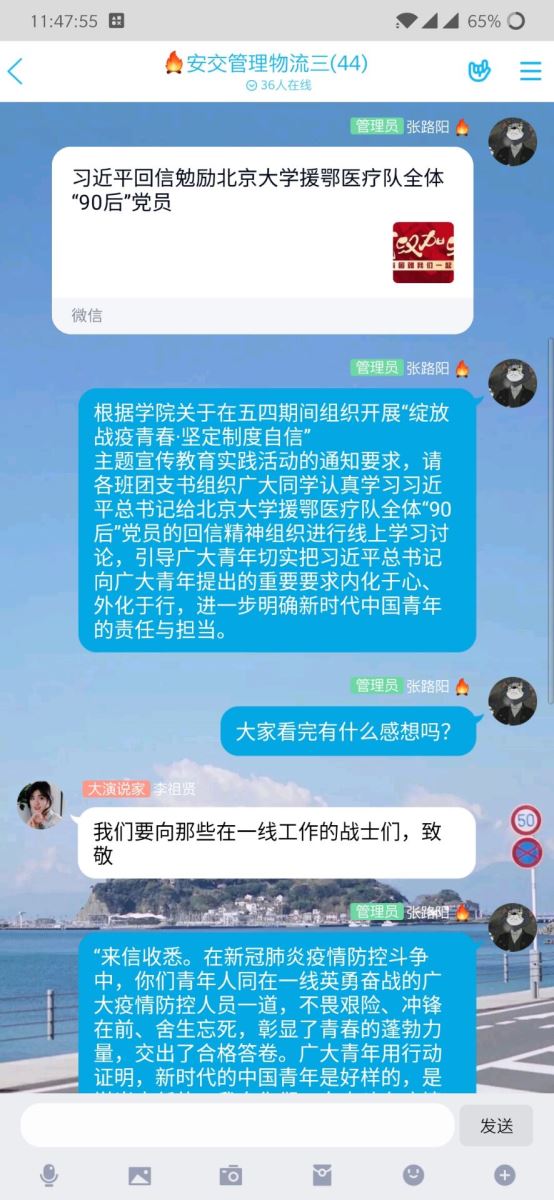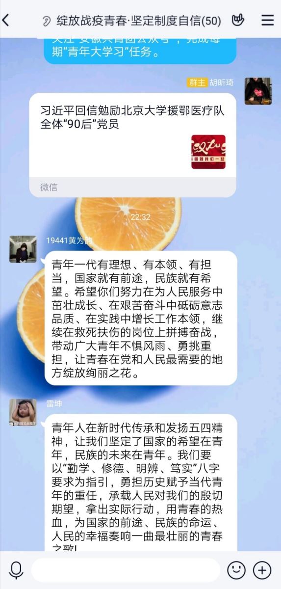 活动中,各班团支书组织团员青年开展线上主题讨论,学习讨论了习近平总书记给北京大学援鄂医疗队全体“90后”党员的回信,激励和引领广大青少年进一步坚定制度自信,在党和人民最需要的地方贡献力量,绽放青春。另外,各支部深入开展“青年大学习”行动,组织青年关注“安徽共青团公众号”,完成每期“青年大学习”任务,深入学习习近平总书记关于疫情防控工作的重要讲话和指示批示精神。同学们积极发言,讨论了自己的想法,活动后,各团支部还进行了活动总结。