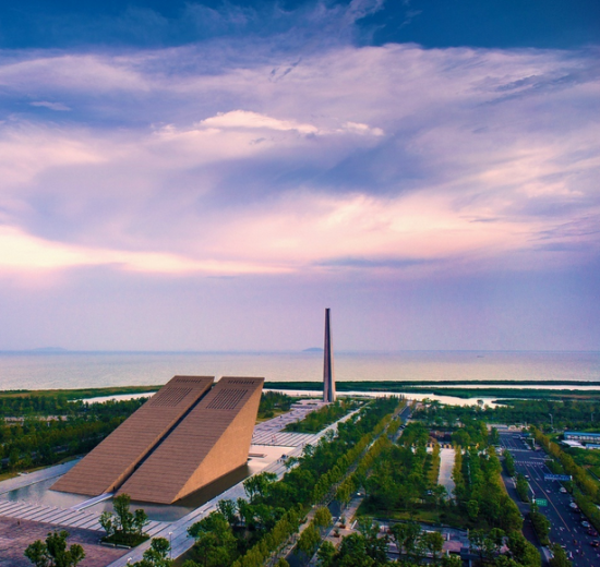 由南向北为五角星胜利塔、总前委群像和渡江战役纪念馆