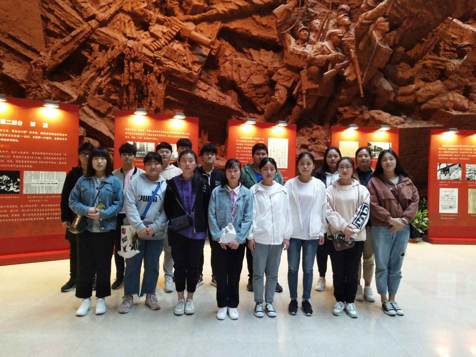 先辈们的艰苦卓绝让人记忆深刻,磅礴巍峨的纪念馆,让大家铭记着这段光辉岁月。我班同学的积极性和凝聚力也令人印象颇深——活动中,同学们整齐有序,充满热情,十分有纪律性。希望大家也能在三年的大学时间里学业有成,在人生的漫长奋斗历程中开辟一番宏图伟业。(供稿人:18441邓正一)