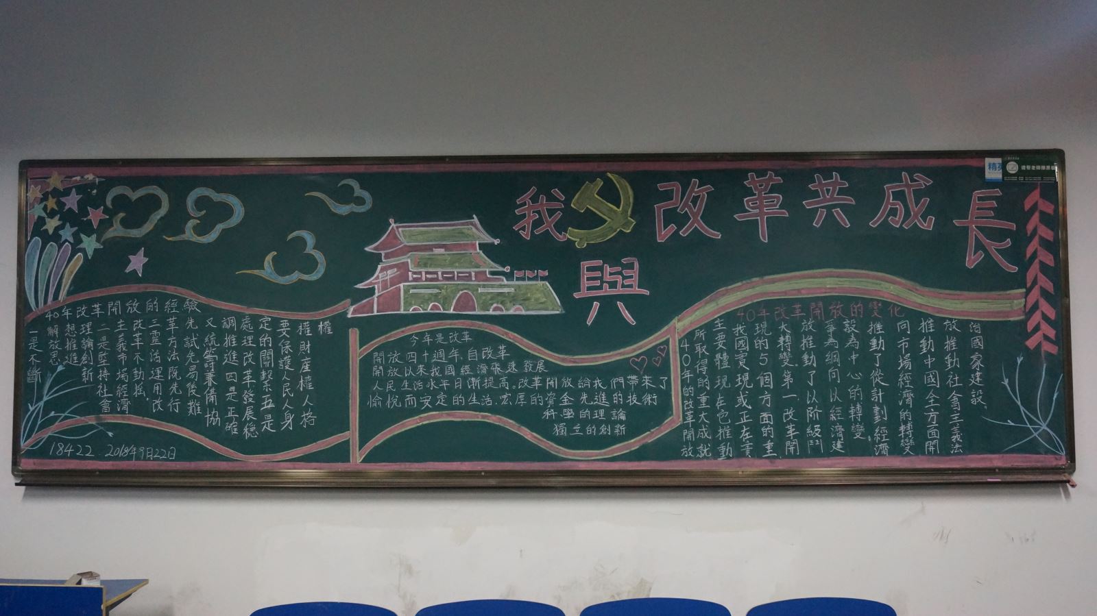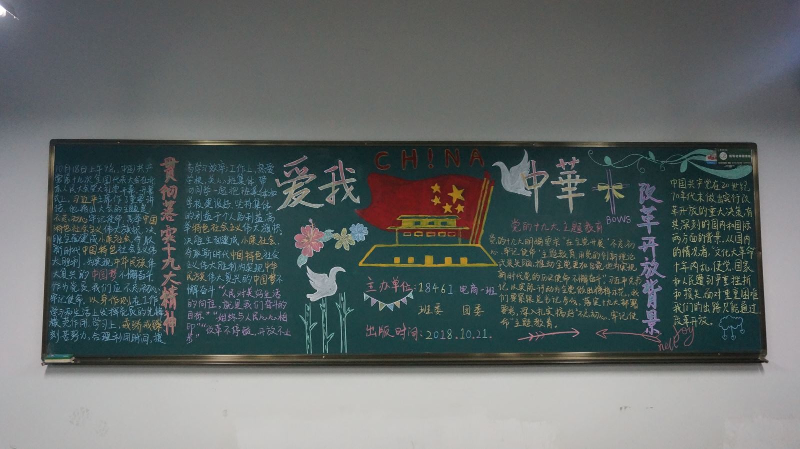 这次活动的目的是通过绘制板报让各班同学更加深刻了解改革与发展的重要性,加强学校的改革教育性进程。在本次活动进行中,我们以班级为单位绘制板报。各班同学积极参与并用心绘制板报,以此来表达对祖国发展的崇敬,从中感悟改革历史的沧桑岁月。最终18443班的黑板报脱颖而出,荣获一等奖。(撰稿人:18423王莹 17423王情)