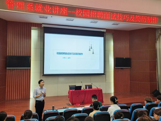 整场讲座历时两个小时,同学们一致认为获益匪浅。陶琪表示,金老师的讲座给大家增添了更多的信心和力量,希望同学们认真感悟,消化吸收,内化为今后的实际行动。就业只是人生道路的一个起点,而不是终点。无论选择哪个行业、从事哪种工作,同学们都应该保持积极的心态和追求卓越的态度。成功的道路充满挑战,但只要保持努力和坚持,就一定能够实现自己的梦想。(管理系姜薇)