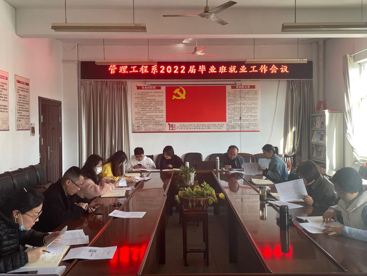 2022年3月9日下午,管理工程系在系五楼会议室召开2022届毕业生就业工作会议。管理系书记汪思曼、副主任岳朝晖(主持工作)、副主任吴金菊、主任辅导员何基荣以及全体毕业班(含社招班)辅导员参加了会议,会议由汪思曼主持。