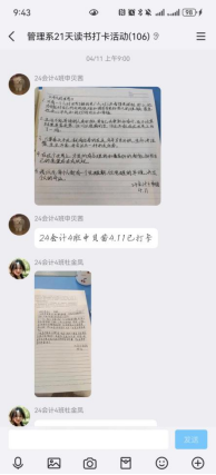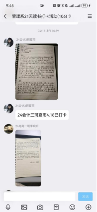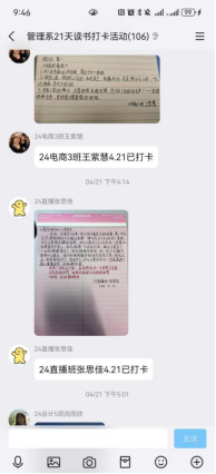 为推进书香校园建设,激发同学们的阅读热情,4月-5月,管理系精心挑选了十本书籍作为推荐书目,策划了以“共沐书香 青年有为”为主题的阅读月系列活动。从4月的“21天阅读打卡”,到5月的一场沉浸式阅读沙龙,管理系近百名学生积极参加,营造了良好的阅读氛围。