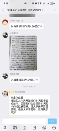 21天的打卡期间,同学们制定了阅读计划,利用课余的碎片化时间阅读推荐书籍,在群里记录自己的阅读时光,分享自己的见解和感悟。他们以书会友,在心得交流中遇见了志同道合的朋友,养成了良好的阅读习惯。