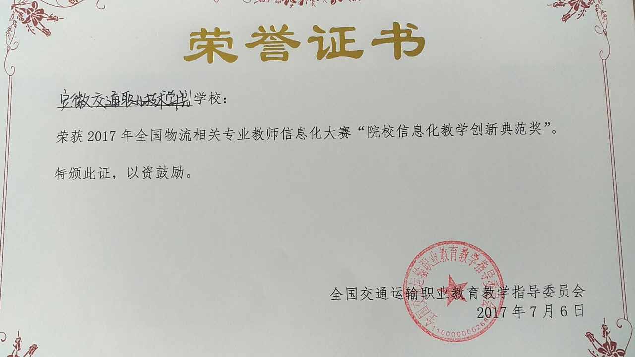 由全国交通运输职业教育教学指导委员会主办、全国交通运输职业教育教学指导委员会交通运输管理类专业指导委员会和长风职业教育研究院承办的2017年全国物流相关专业教师信息化大赛决赛,于2017年7月4日—6日在内蒙古赤峰成功举办,来自全国各地120名教师进入决赛。最终,管理工程系李娟玲老师荣获大赛二等奖,由胡勇、周伟、范爱理三位老师组成的团队获得大赛三等奖。主办方向26所中高职院授予“院校信息化教学创新典范奖”,米兰位列其中。