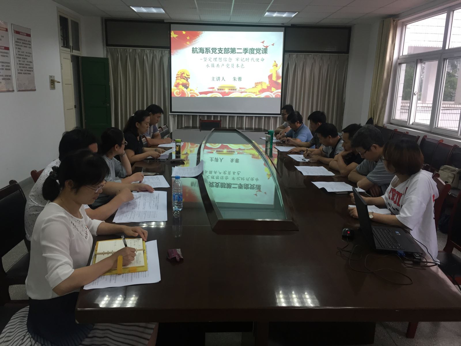 6月22日,党支部书记朱蓉带领全体党员、骨干教师、学生代表前往裕溪中学开展了一次主题为“弘扬航海文化 共筑校园航海梦”的党员日活动;6月25-26日,航海系教师张守甫、桂春元、杨皓然共同赴利辛高级中学、涡阳二中两所生源基地开展高招宣传工作;6月28日,党支部书记朱蓉参加了院党委委员、纪委书记陈明作“七一”党课报告,7月4日听取了院党委委员、副院长王丰胜作“七一”党课报告,并于当日为航海系全体党员作了一场主题为“坚定理想信念 牢记时代使命 永葆共产党员本色”的精彩报告。;7月4日,全体党员积极参加了党的十九大和新修订党章的知识测试。