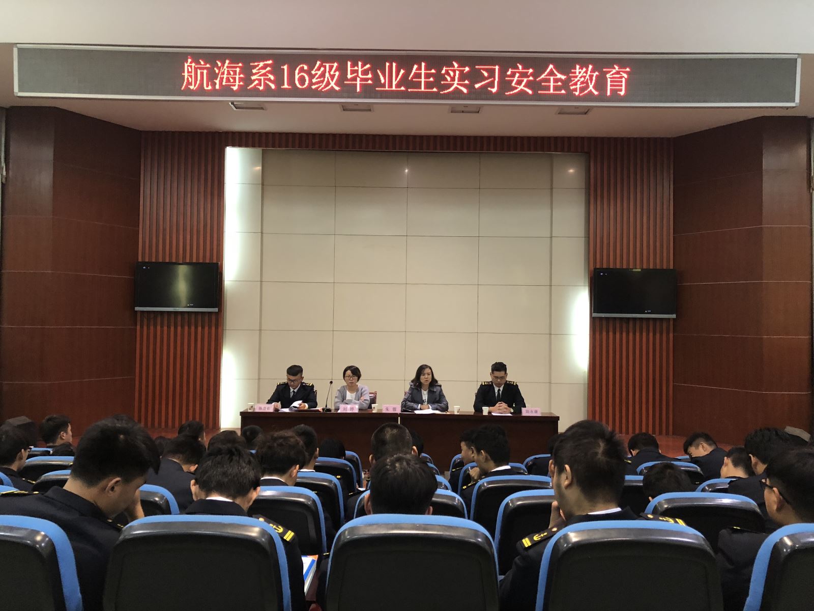 2018年11月5日晚,航海系在多功能报告厅举行“10月份半军管月总结大会”。航海系党支部书记朱蓉、系学管刘婷老师、16、17、18级全体学生参加了会议,本次会议由刘婷老师主持。