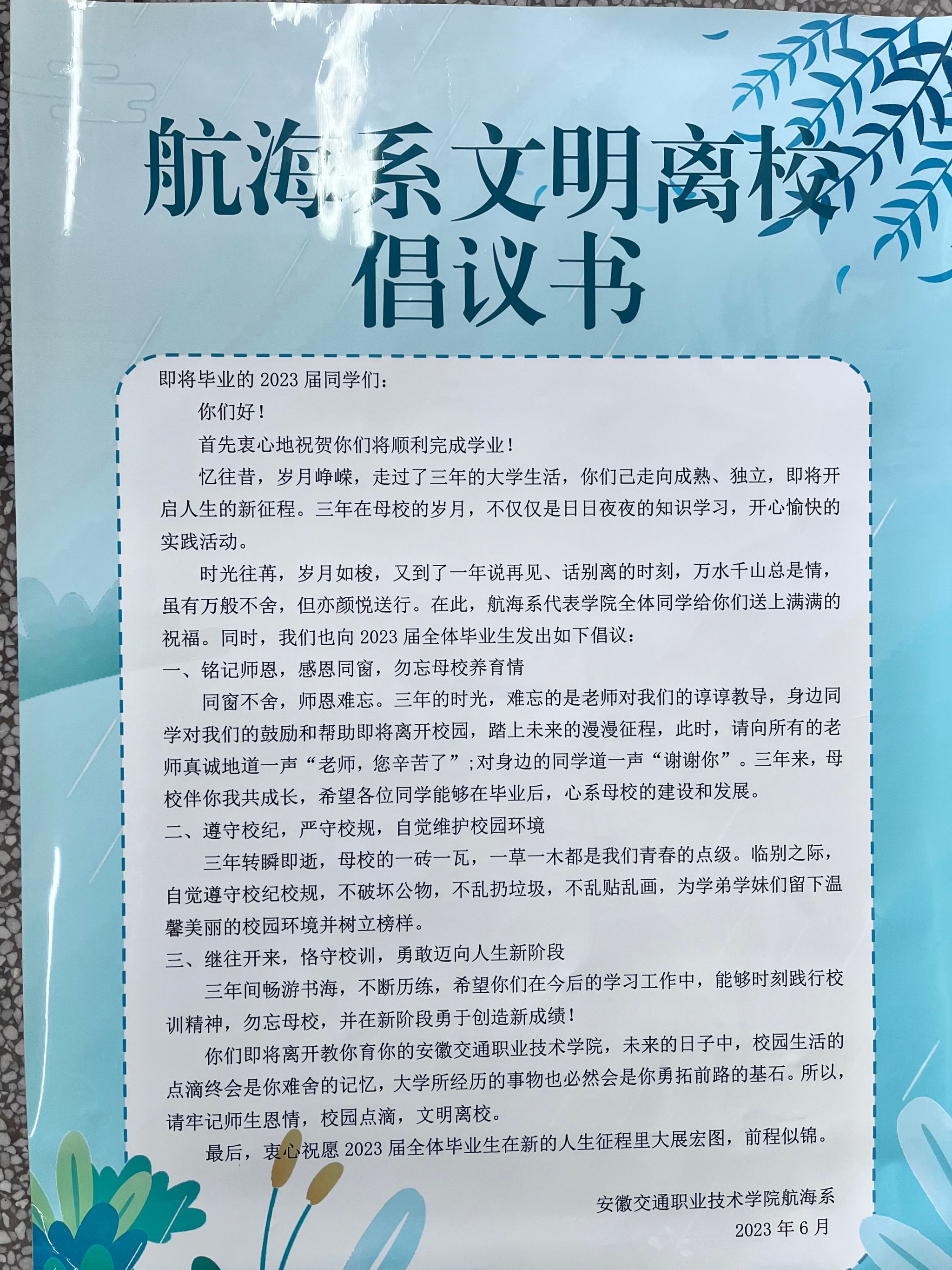 为保证2023届毕业生顺利离校,踏上人生新的征程,航海系领导班子高度重视,系学生管理办公室统筹协调,认真部署毕业生文明离校工作,大力倡导文明之风,强调离校纪律,确保毕业生文明、平安、有序离校。