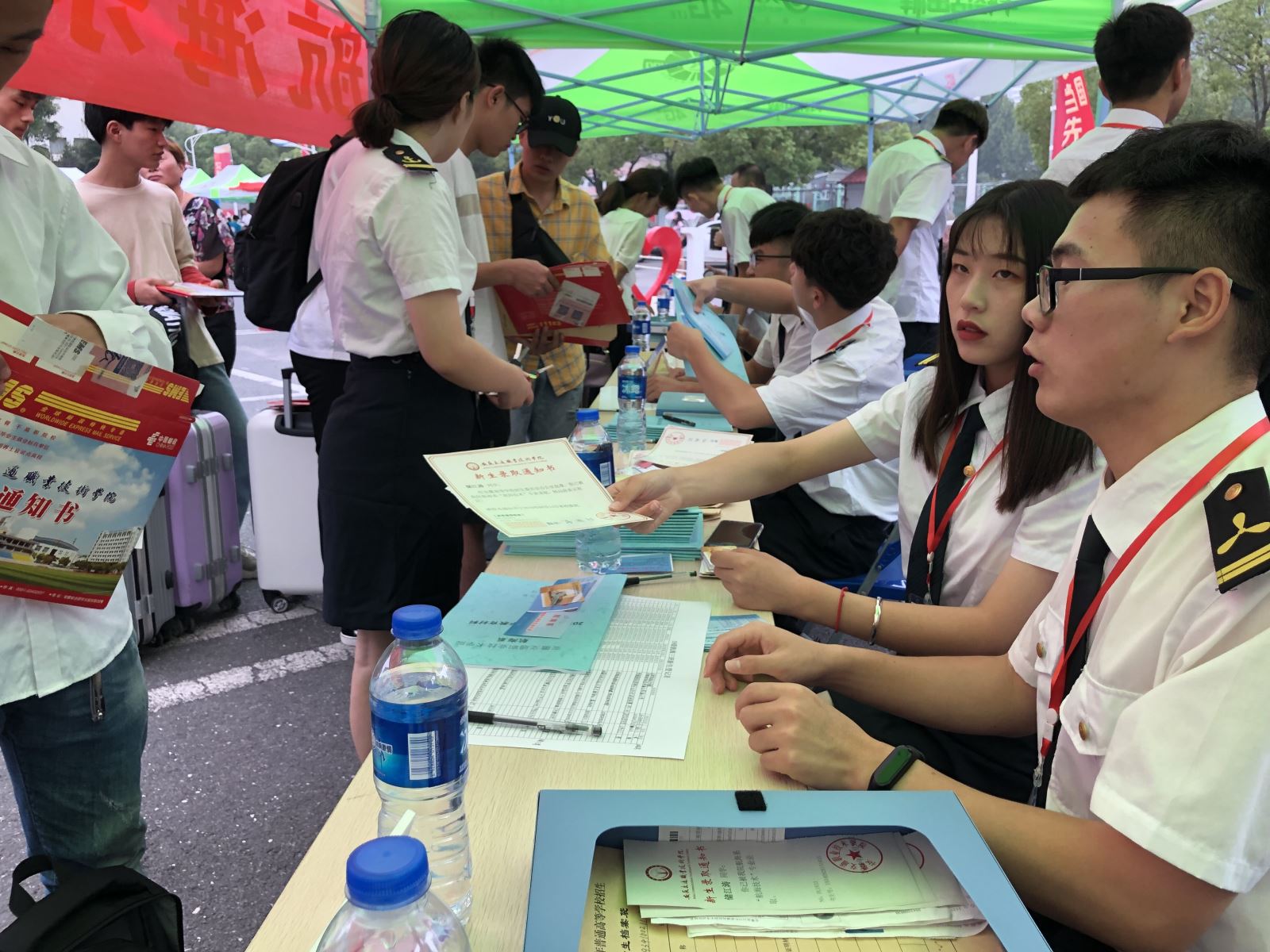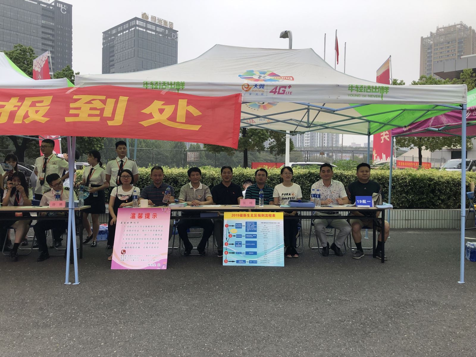 新生报到当天,所有工作有条不紊地进行,迎新的老师和学生各司其职。
