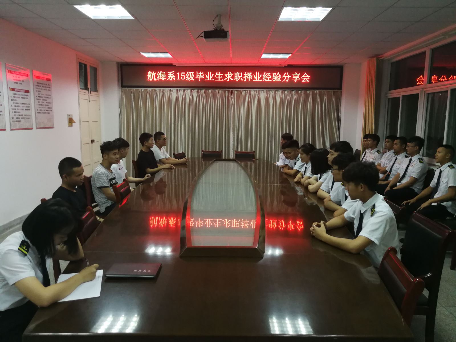 航海系还举行了2018届毕业生求职择业经验分享会,邀请了15级的几位毕业生同学为航海系低年级的学生作经验交流。这几位毕业生的就业方向各不相同,有自主创业成功的,也有考到大证上船成为船员的,还有进私企的,尽量满足有不同就业意向的学生。通过交流学习、找工作中的各种琐事,为低年级学生提供一些建议,尽量避免他们走入误区。