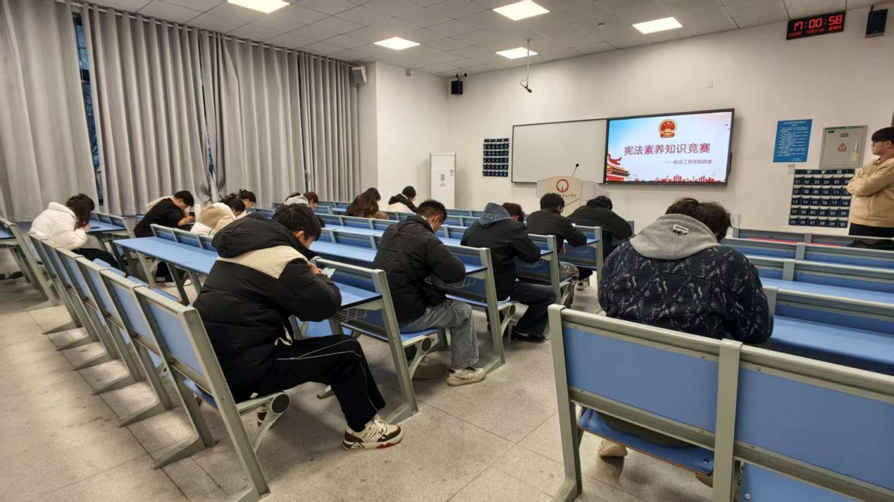 12月11日,学院面向全院学生在尚能楼开展宪法素养知识竞赛。竞赛题目围绕宪法基本知识、公民权利义务、法治理念等重点内容设计,全面检验学生对宪法文本的理解程度以及运用法治思维分析和解决问题的能力。赛场上,参赛选手认真作答、沉着应战,展现了航运学子扎实的法律素养和积极向上的精神风貌。现场悬挂“角逐宪法知识,弘扬法治力量”的主题横幅,营造了尊崇宪法、学习宪法的浓厚氛围。