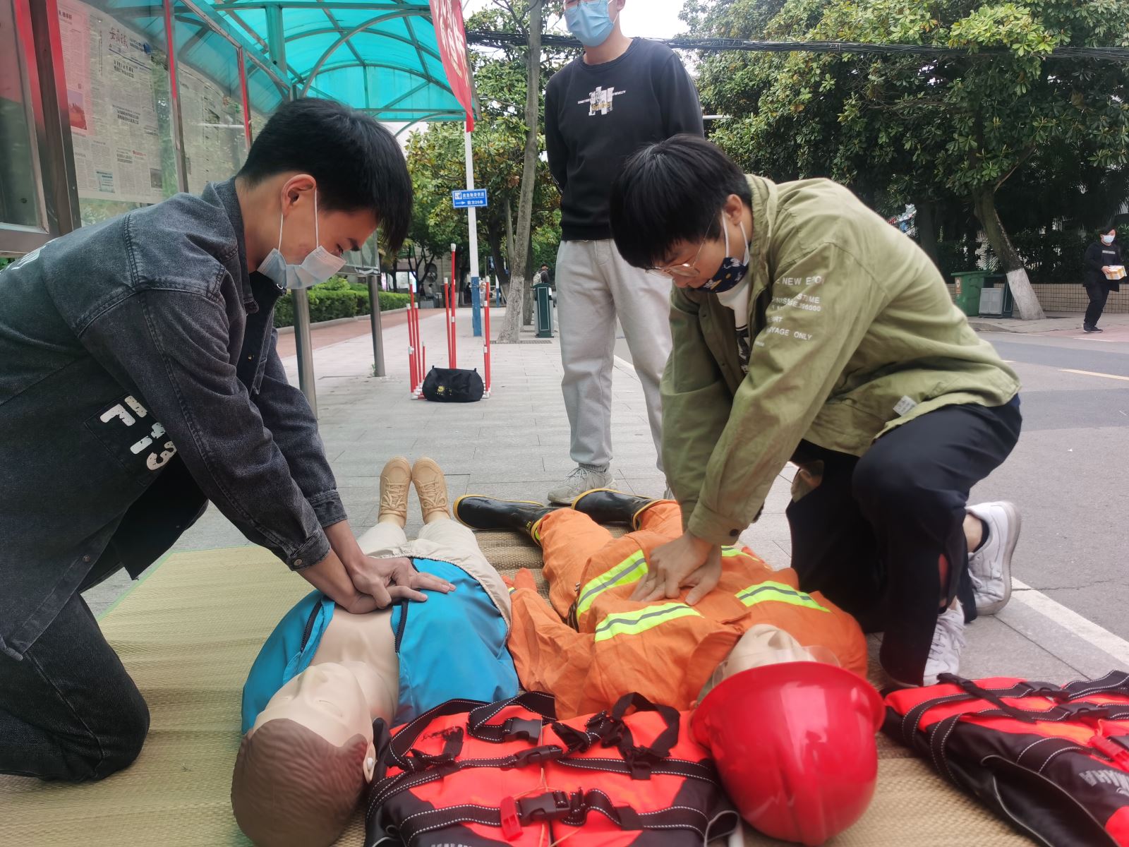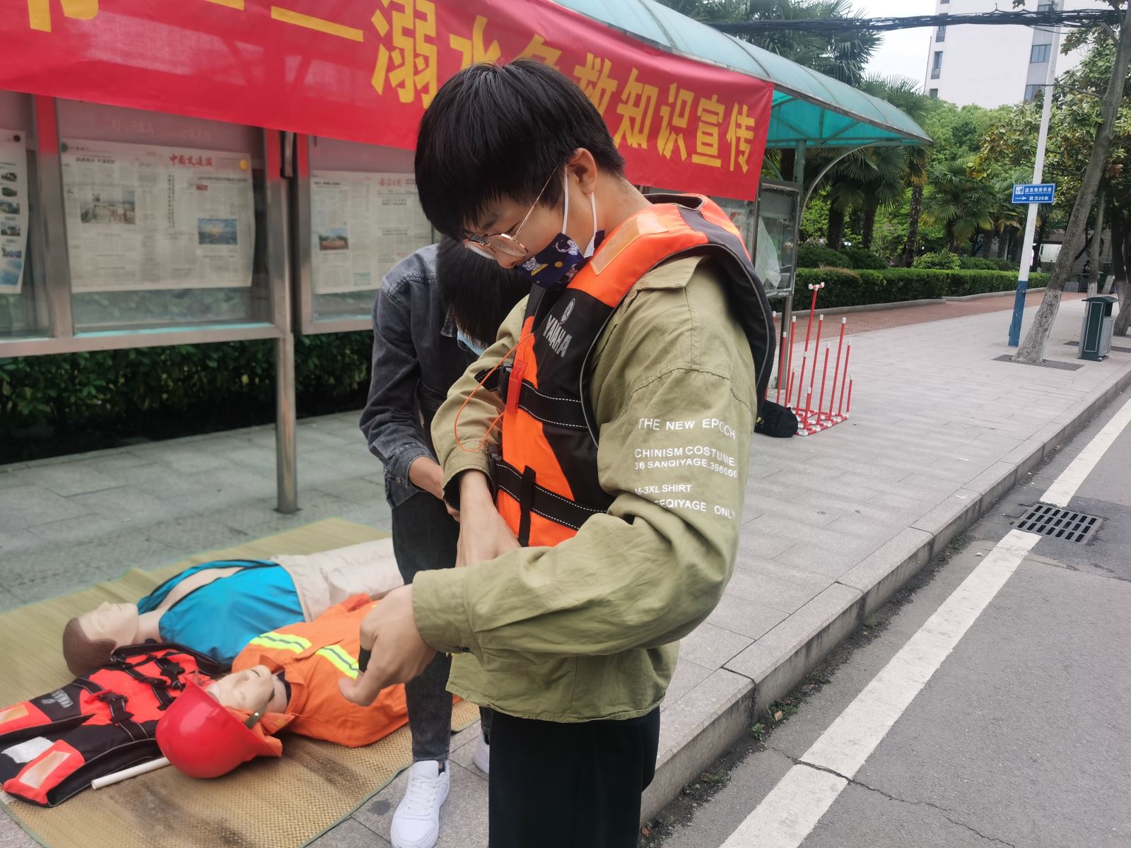在教学楼门口,航海系学生运用所学航海急救知识,详细为大家宣讲了防溺水常识和应急救护知识,并在现场就自救互救、救生衣的穿法、心肺复苏和海姆立克急救法等安全急救常识及技能与围观同学进行了互动教学。本次活动丰富了学校防溺水安全教育手段,提高了学生自我防护意识和应急自救能力。