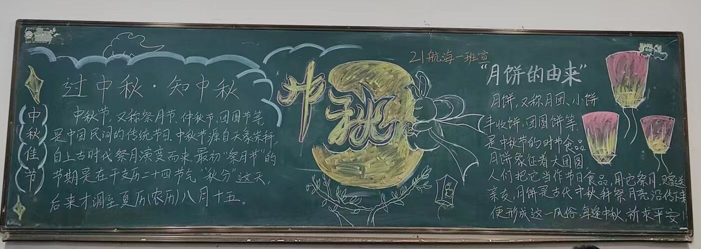 在教师节和中秋节双节来临之际,为进一步继承和发扬传统文化,丰富校园文化内涵,弘扬尊师重教美德,航海系团总支组织开展了以“迎中秋,敬师恩”为主题的黑板报评比活动。