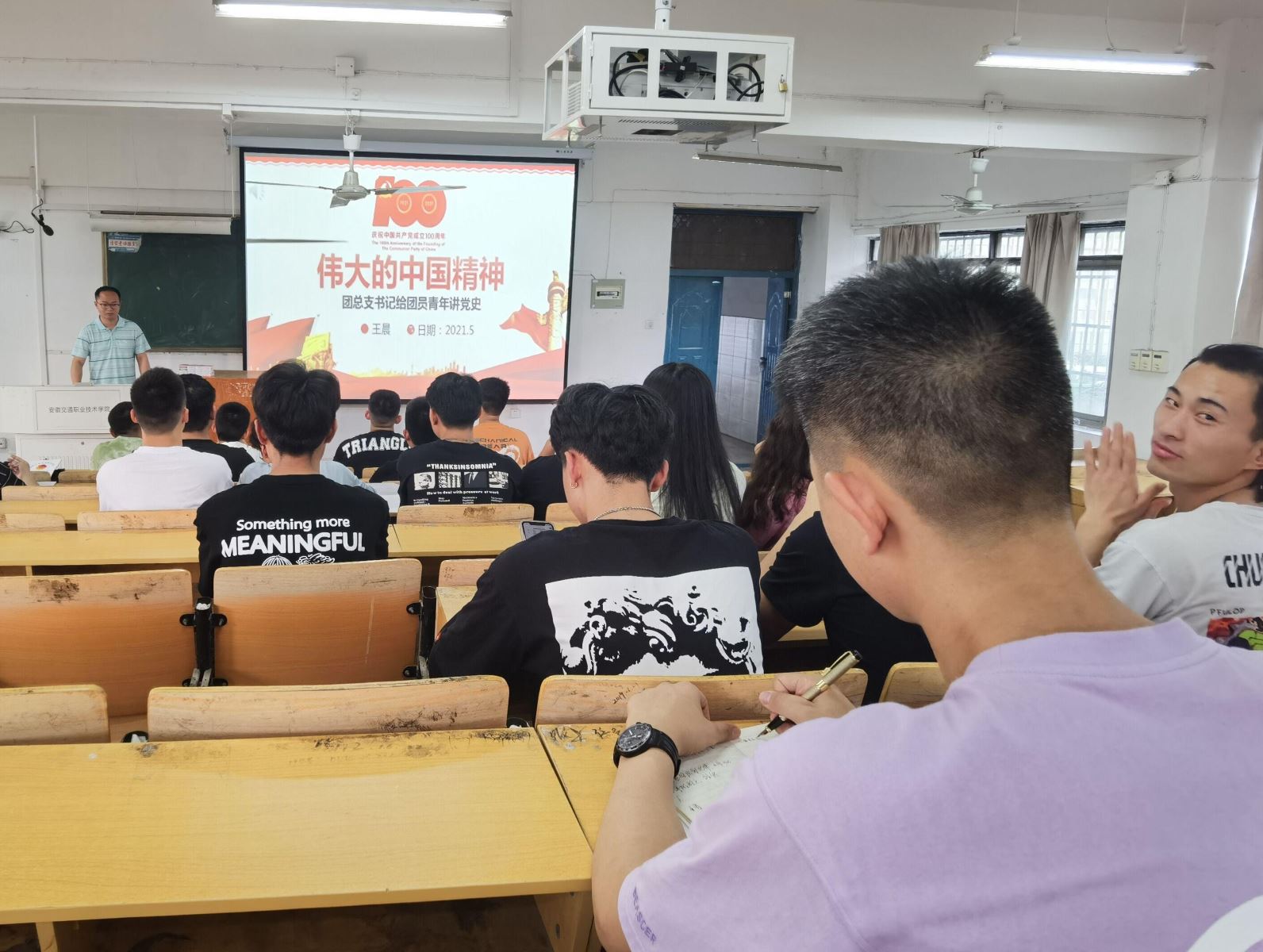 授课开始,王晨老师说:“今年是中国共产党建党100周年,党中央今年在全党开展党史学习教育,具有十分重要的意义。党旗所指就是团旗所向,全体学生干部、团员青年,要深刻认识开展党史学习的重要意义,把思想和行动统一到党史学习和干事创业上来,做到学史明理、学史增信、学史崇德、学史力行”