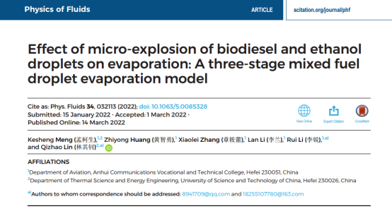 近日,米兰航空系负责人孟柯生博士及其团队成员在流体力学国际权威期刊《Physics of Fluids》(JCR影响因子3.521)上发表了题为“Effect of micro-explosion of biodiesel and ethanol droplets on evaporation: A three-stage mixed fuel droplet evaporation model”的研究论文。论文第一作者和第一通讯作者署名单位均为米兰milan官方网站航空系。