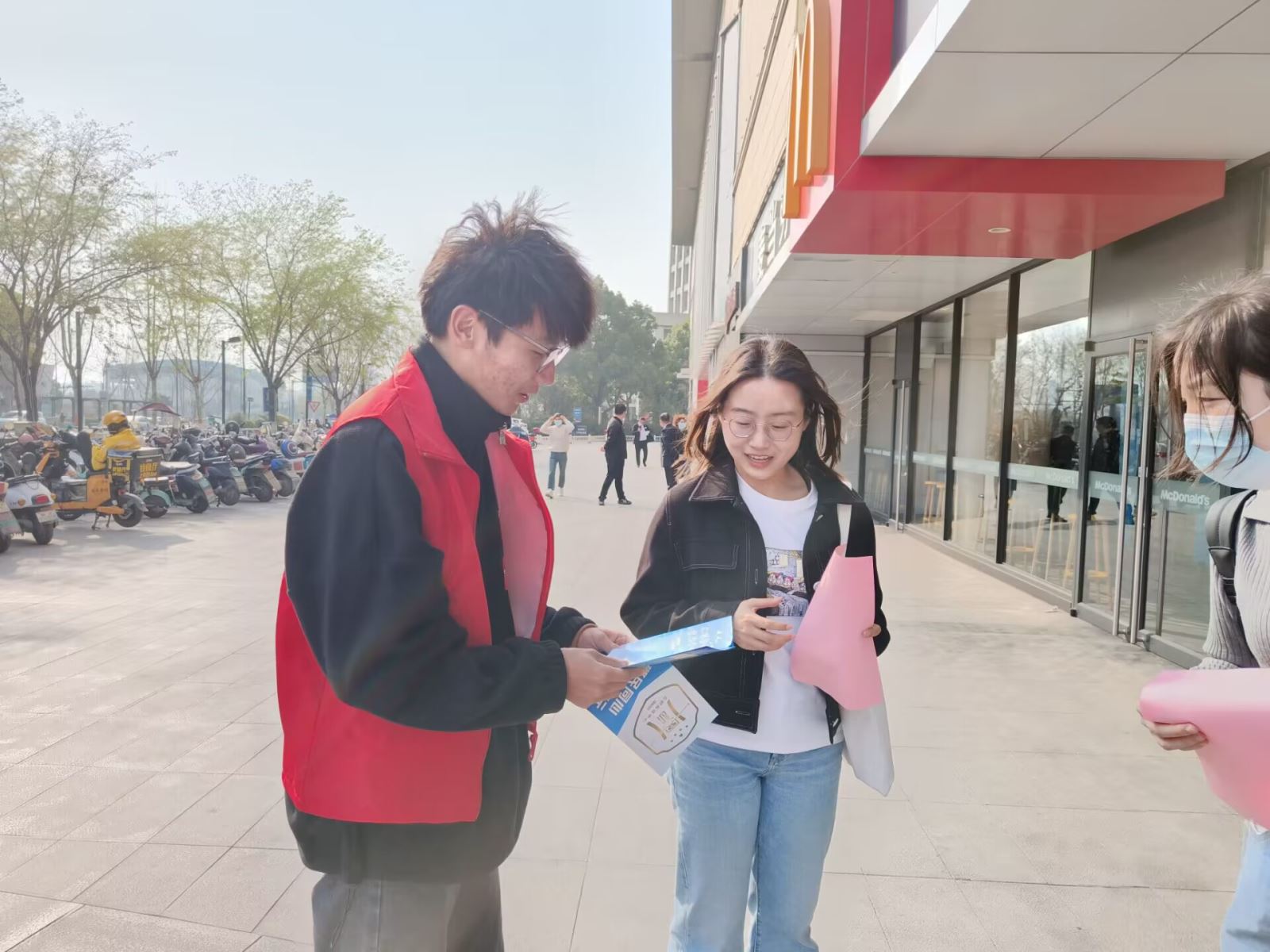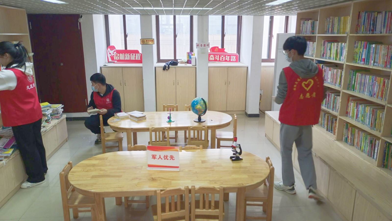 到达地点后志愿者们分为三组,分别完成发放传单、整理图书以及慰问老人的工作。同学们怀着饱满的热情,笑容真诚,积极投入志愿服务工作中去。