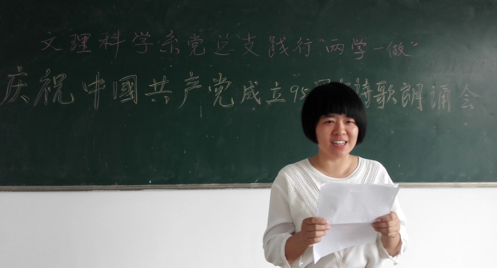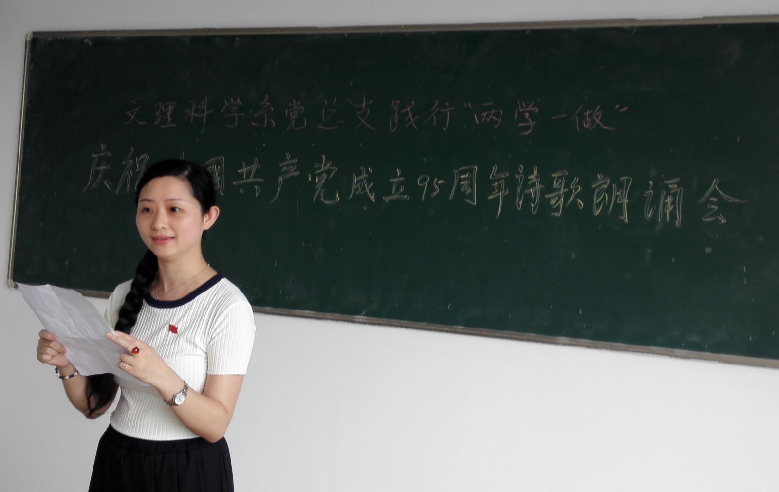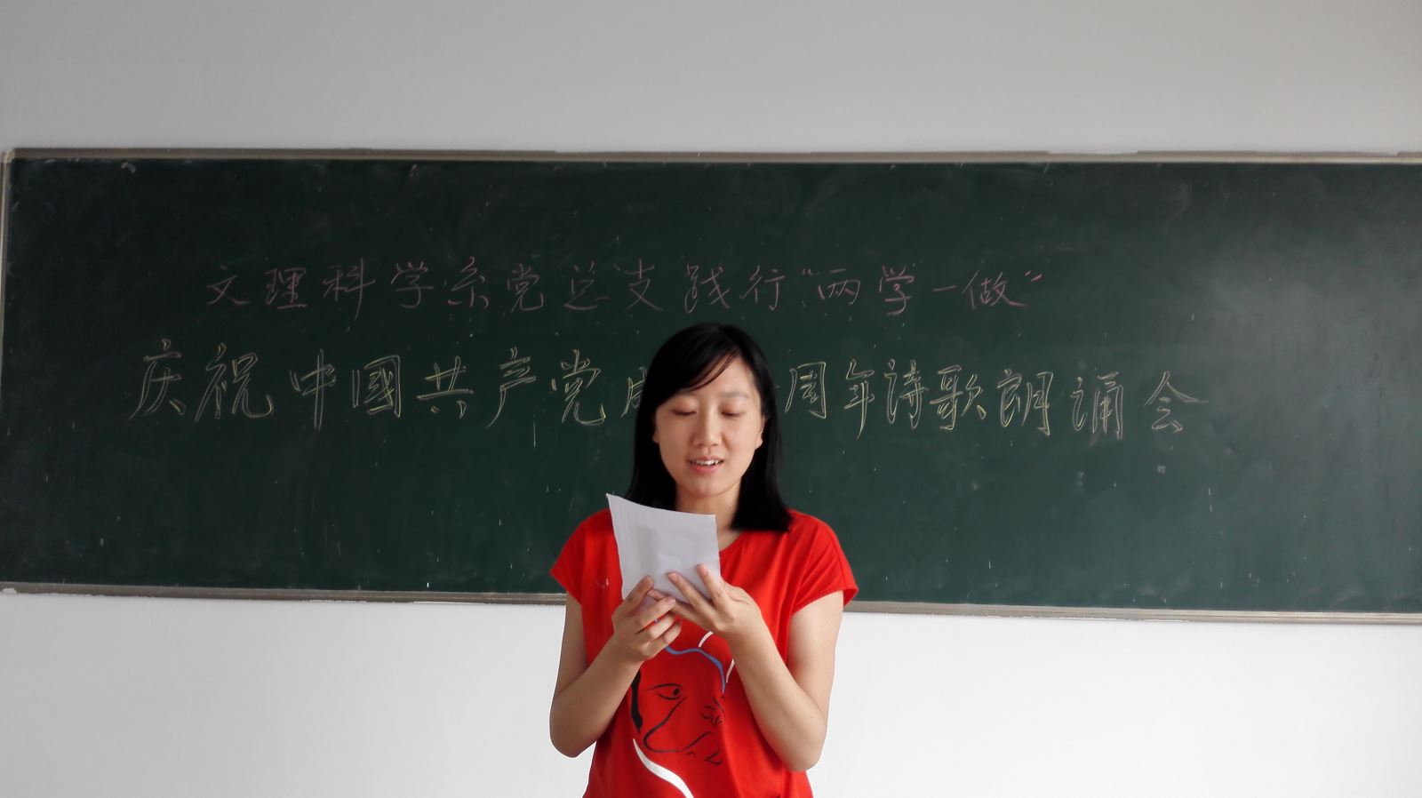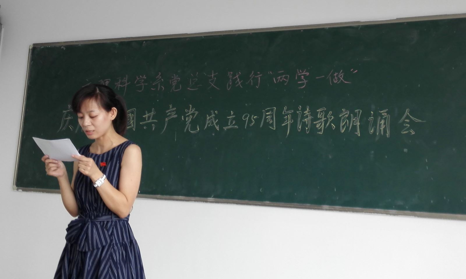 七月的合肥,绚丽多姿、热情奔放。七月的党徽,金光闪闪,光芒四射。在这个火红的日子,我们迎来了党的95周年华诞。为了进一步激发全体党员的爱党爱国热情,深入推进“两学一做”学习教育,文理系党总支于6月29日,在413教室举办了以“永远跟党走,践行‘两学一做’”为主题的“庆祝中国共产党成立95周年”诗歌朗诵会。