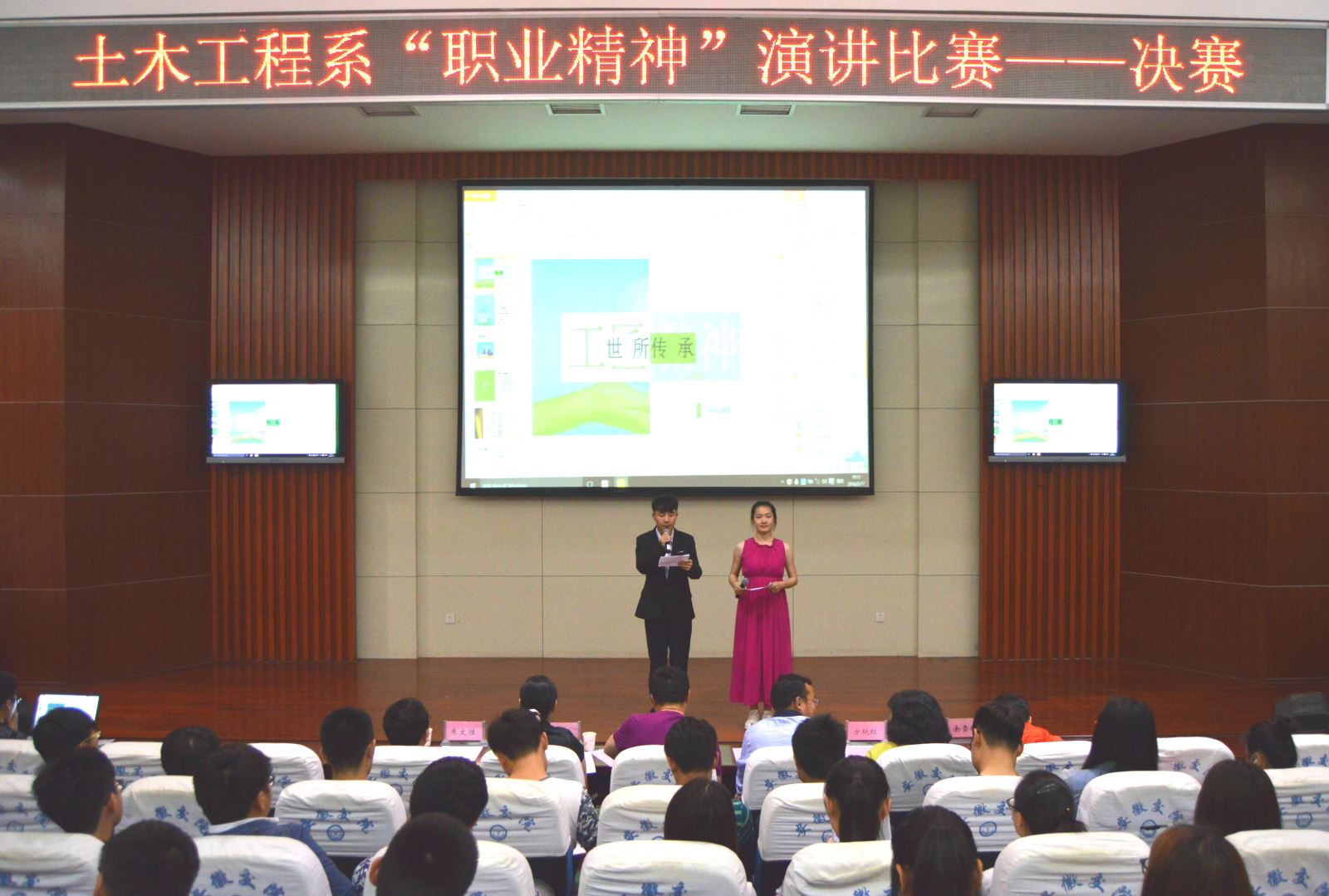 在一个多小时的演讲中里,每一位选手们从各方面积极展示了他们心中关于职业精神的诠释;细细地讲述了他们眼中的土木精神和工匠精神。列举了大量正反事例阐述了职业精神的重要性,表示要以敬业奉献的典范为榜样,以博大精深的土木文化和勤奋通达敬业乐群的校训为引导,争做土木工程的铺路石和开拓者,使自己成为一个坚定,踏实,精益求精的土木工匠。