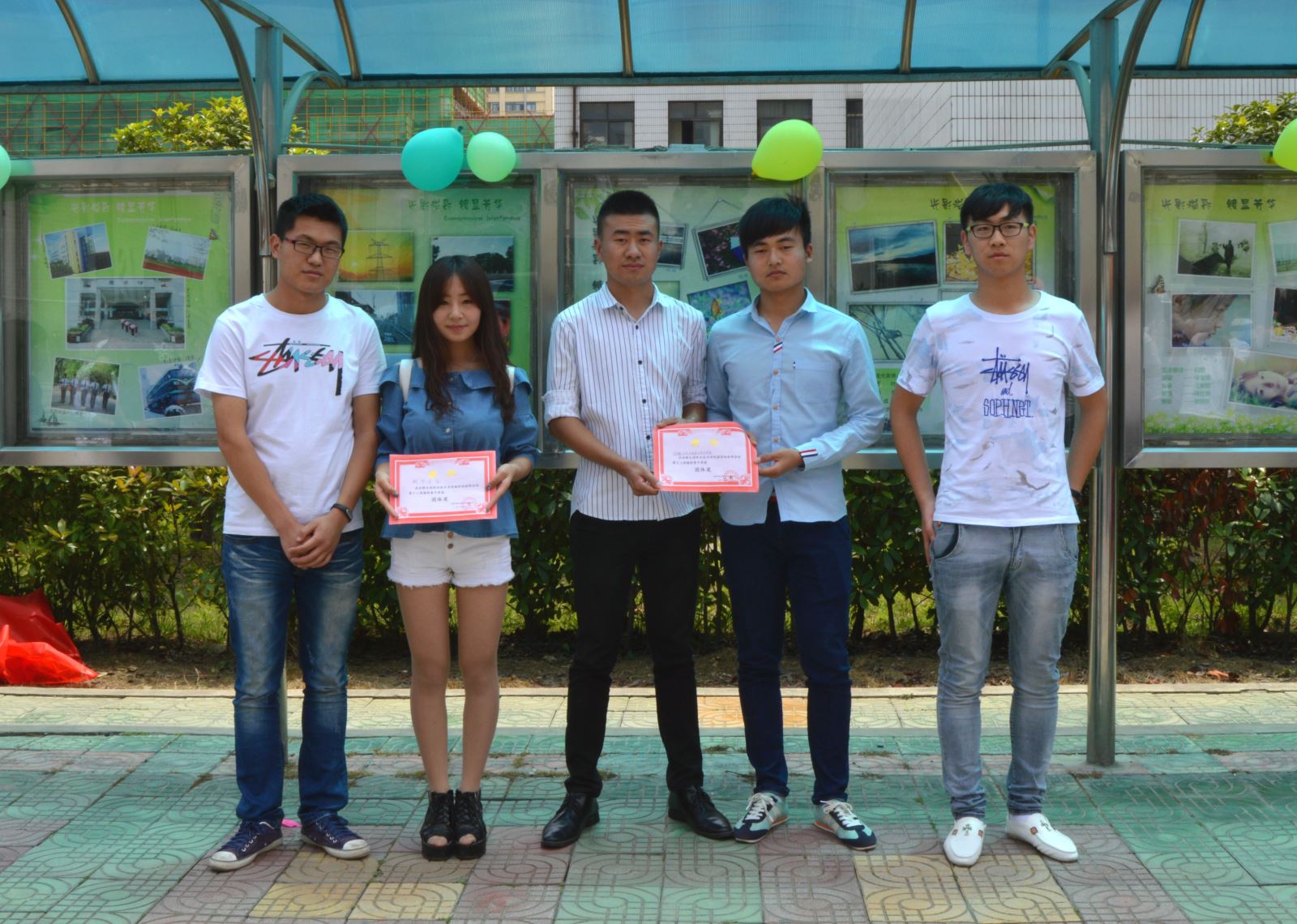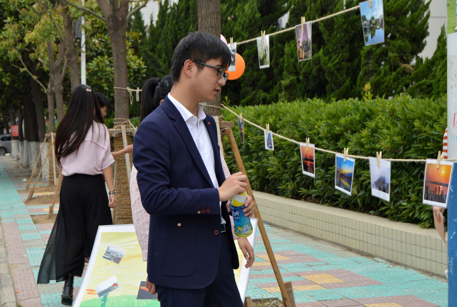 主办者还富有创意地在橱窗对面道路旁的大树之间拉上细绳用木夹吊起各种类型的摄影作品供同学们参观,大家被这新颖的展出形式所吸引,纷纷为此次影展点赞。