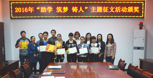 4月22日, 由院学生资助中心主办的2016年“助学•筑梦•铸人”主题征文活动颁奖仪式在学生处二楼会议室举行。各系学生资助工作负责老师及获奖学生代表参加活动。