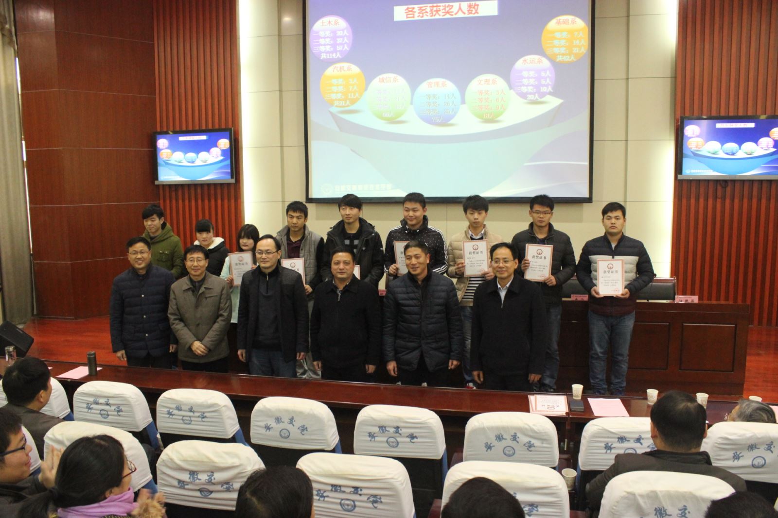 大会对2015年学院技能大赛“活动月”各项工作进行了总结。院领导对首次技能大赛“活动月”各项工作高度重视,大力支持并亲临赛场观摩、指导;各系认真筹备、积极落实;赛项立足教学、突出专业特点、注重提高职业技能;学生普遍参与、大赛组织严谨有序、工作人员尽心尽力;指导教师队伍强大,参赛选手各显才华,竞赛成绩斐然,圆满完成了既定的各项工作任务。“活动月”期间共举办19个赛项,864位学生、42位指导老师、93位校内外评委专家、30位工作人员、50位志愿者参与其中。最终574位同学进入决赛,共有64位同学获得一等奖、116位同学获得二等奖、176位同学获三等奖(其中土木系114人,汽机系21人,城信系66人,管理系75人,文理系13人,水运系20人,基础系42人),评出优秀指导教师18人,院、系领导分别为获奖师生颁奖。本次技能大赛活动月参与人数多,范围广,真正起到了“以赛促改、以赛促建、以赛促教、以赛促学”的作用,获得一致好评。