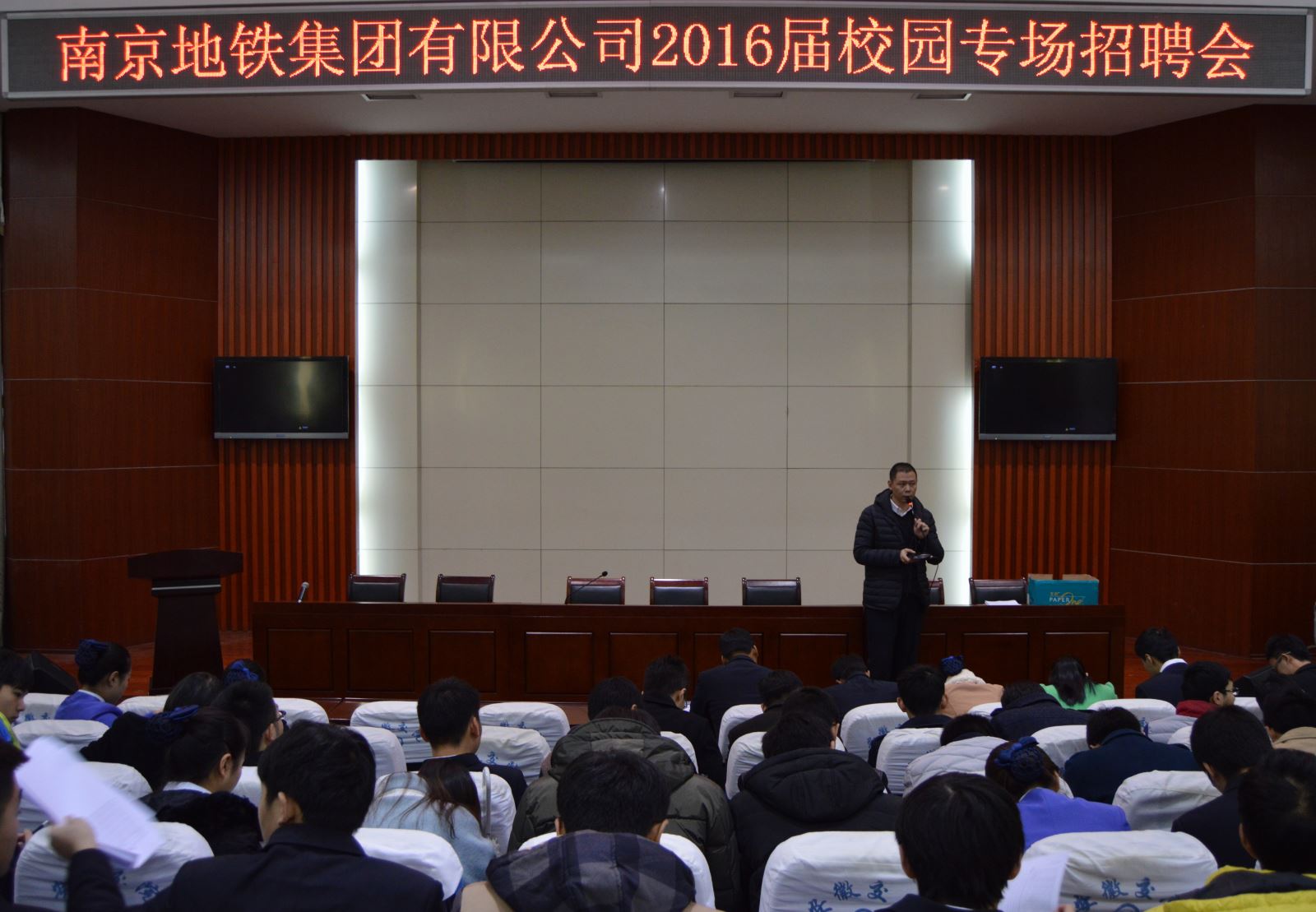 11月24日上午,南京地铁集团有限公司在北区多功能报告厅举办2016届校园专场招聘会, 约240名2016年毕业生参加招聘会。
