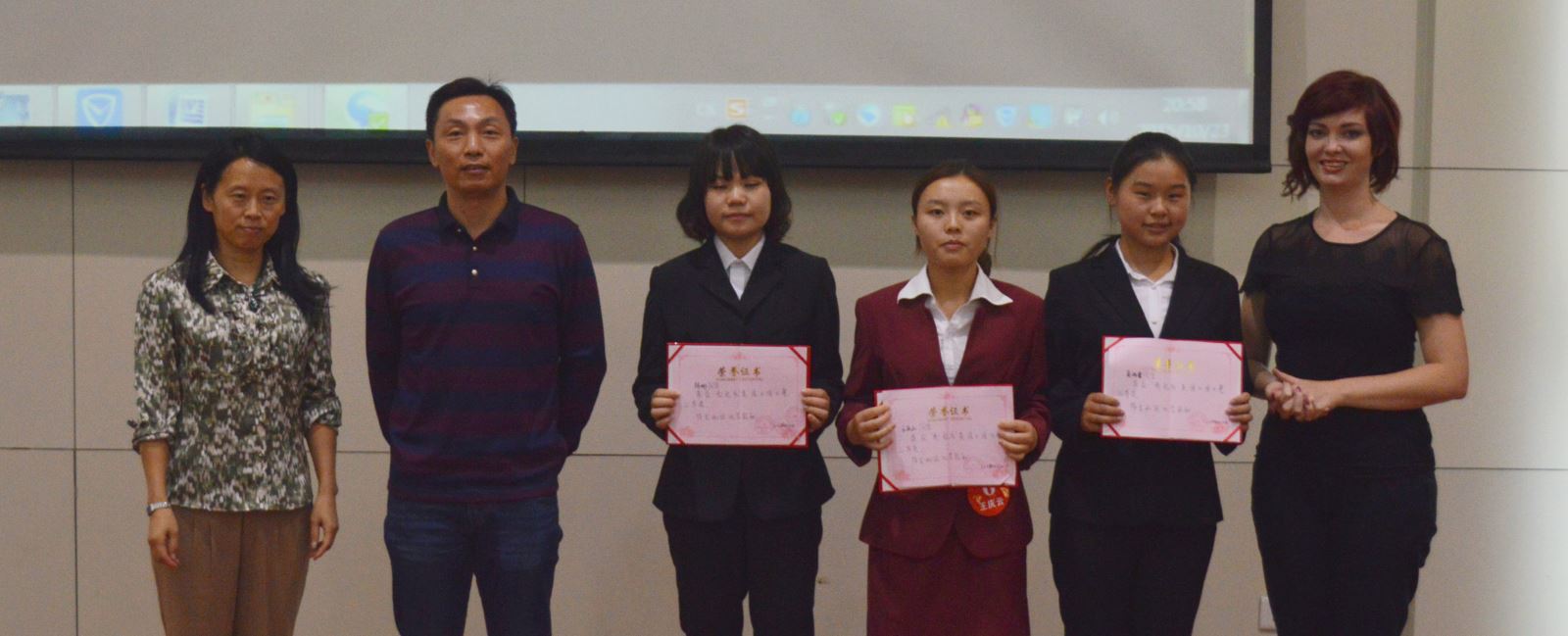 第二轮比赛中选手们先后上台对自己制作的PPT用英文进行描述,Lei女士针对他们的演讲进行提问。他们流畅的英语口语,鲜明的主题,充实生动的内容和严密的逻辑表达,赢得了Lei女士的好评。