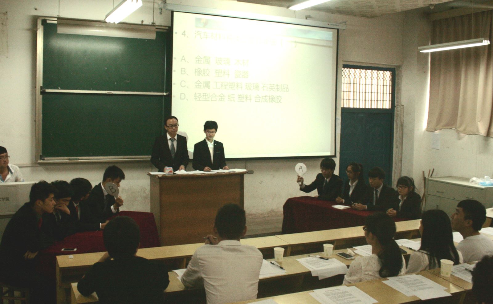 比赛分为必答题、抢答题、观众答题和风险题四个环节。题目涉及领域包括:汽车知识、汽修知识、职业素养等。比赛中,两队选手应对自如,正答率高,难分伯仲,2个班级的同学更是积极响应,在观众抢答环节中,纷纷举手应答,现场气氛热闹非凡。经过紧张的风险题环节,最终14级制造班获得了冠军。