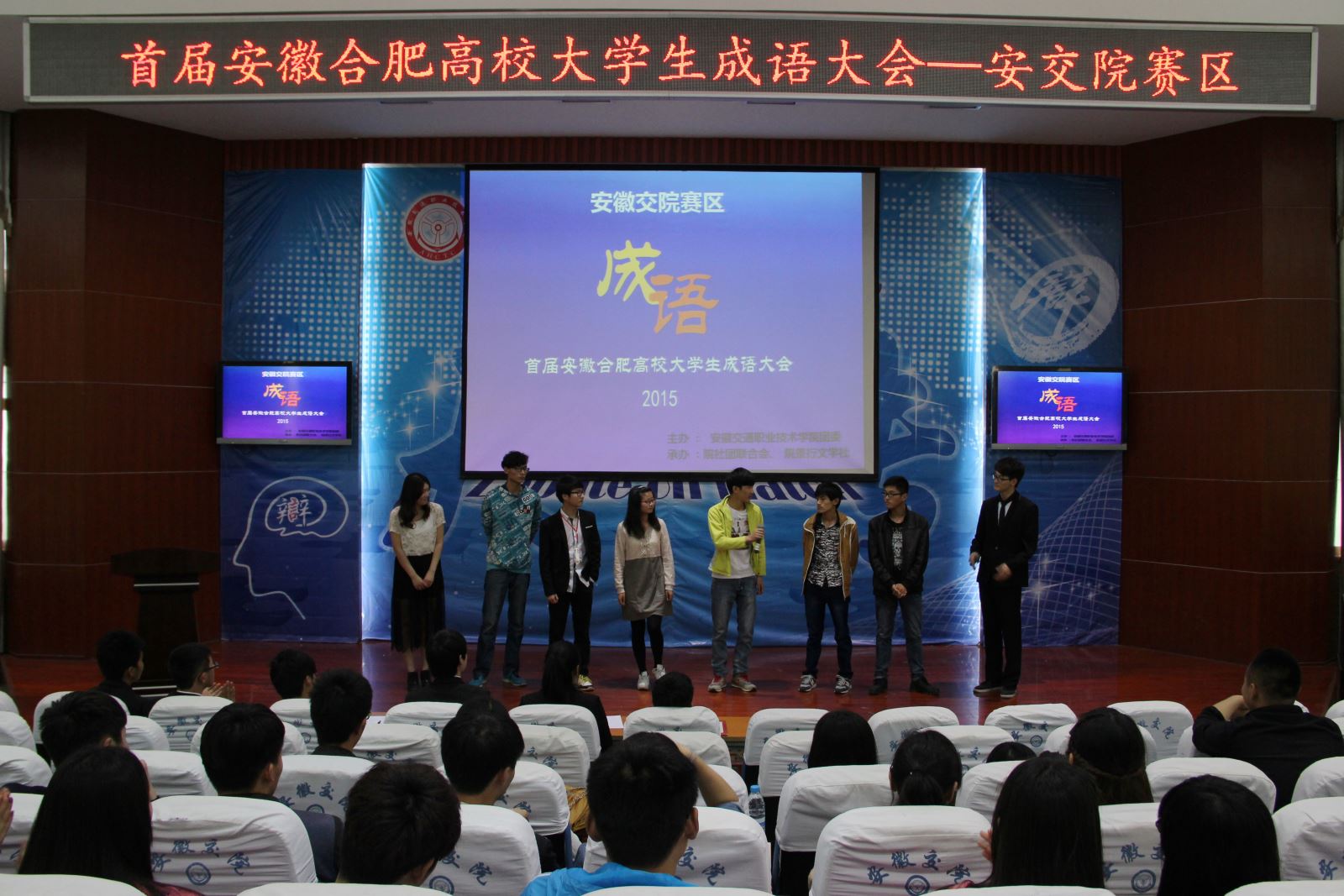 首先上场的A组选手是来自新华学院0梦文学社的同学,两人默契配合,不断猜对成语。紧接着上场的队伍也不甘愿示弱,大家都是激情澎湃,不停的斗智斗勇。尤其是来自安徽财贸职业技术学院白枫亭文学社的C组选手,一次又一次答对了难题偏题,几乎题题秒答,表现出了选手间超高的默契,并以五分的高分进入下一环节。第一节结束,主持人和在场的观众进行了一个成语接龙小游戏,大家踊跃参与,将休息时刻变得妙趣横生。最终来自安徽财贸职业技术学院的同学成为小游戏的胜者,获得了举办方送出的精美小礼品