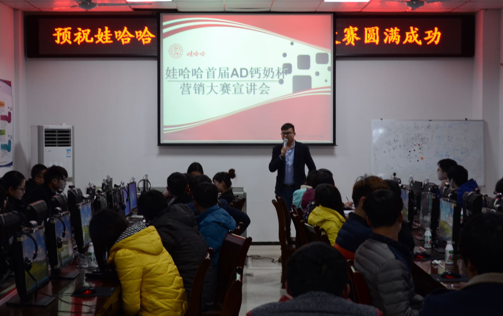 随后,现场负责人介绍了此次营销大赛的内容。此次参赛作品主要是营销策划方案,内容包含40%的创新策划和60%的实战营销。参赛小组需要在方案中选定娃哈哈的某款产品,在娃哈哈的空白市场,未来进行开发和突破的商业领域,营业模式等方面进行策划,将选送优秀作品参加省内评比。