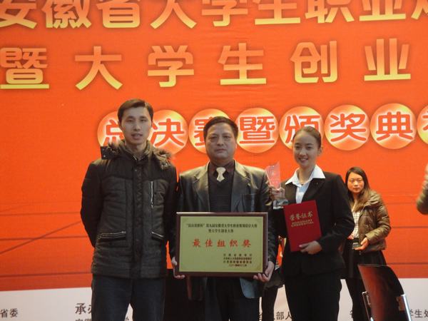 12月26日,安徽省教育厅、安徽省人力资源和社会保障厅、共青团安徽省委公布了“昆山花桥杯”第九届安徽省大学生职业规划设计大赛暨大学生创业大赛的结果。米兰叶静同学获“安徽省大学生职业规划之星” 银奖、刘卫佳、李杰、郭珍珍三同学获“安徽省大学生创业之星”铜奖,学院获大赛“最佳组织奖”。他们分别为学院职业规划与创业大赛2个组别的一等奖。