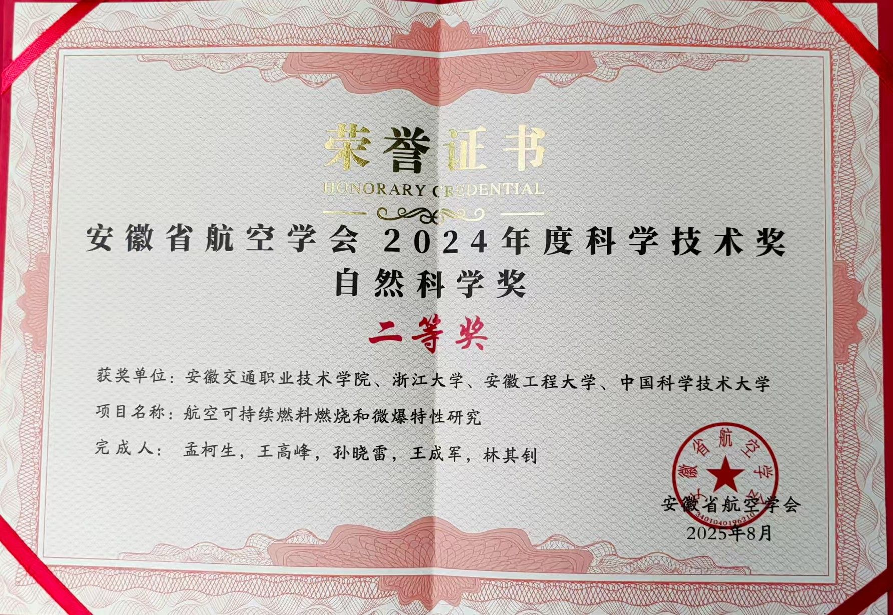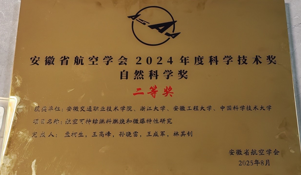 米兰荣获安徽省航空学会科学技术奖自然科学奖二等奖